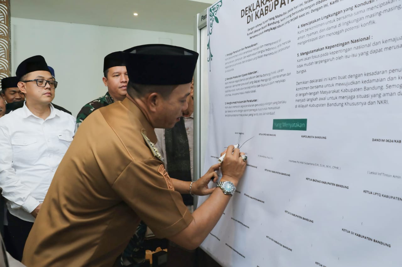 Deklarasi ini berisi komitmen bersama untuk menjaga keamanan, ketertiban, dan kedamaian di Kabupaten Bandung, serta menolak segala bentuk kekerasan dan provokasi yang dapat memecah belah persatuan dan kesatuan bangsa.