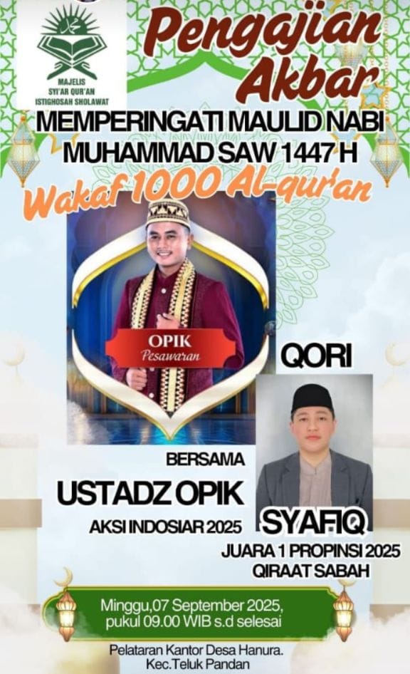 – Minggu 7 September 2025- Peringatan Maulid Nabi Muhammad SAW di Desa Hanura, Kecamatan Teluk Pandan, Kabupaten Pesawaran, berlangsung khidmat dan penuh kebersamaan. Acara yang digelar pelataran GSG MANGlIAWAN desa Hanura, yang dihadiri oleh tokoh agama, perangkat desa, pemuda, serta masyarakat sekitar.