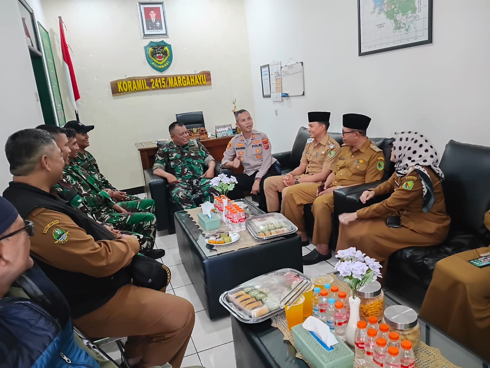 Acara Pemberian Ucapan Ulang Tahun TNI Ke-80 oleh Porkopimcam Margahayu dan Kapolsek Margahayu Di Makoramil 2415/Margahayu.