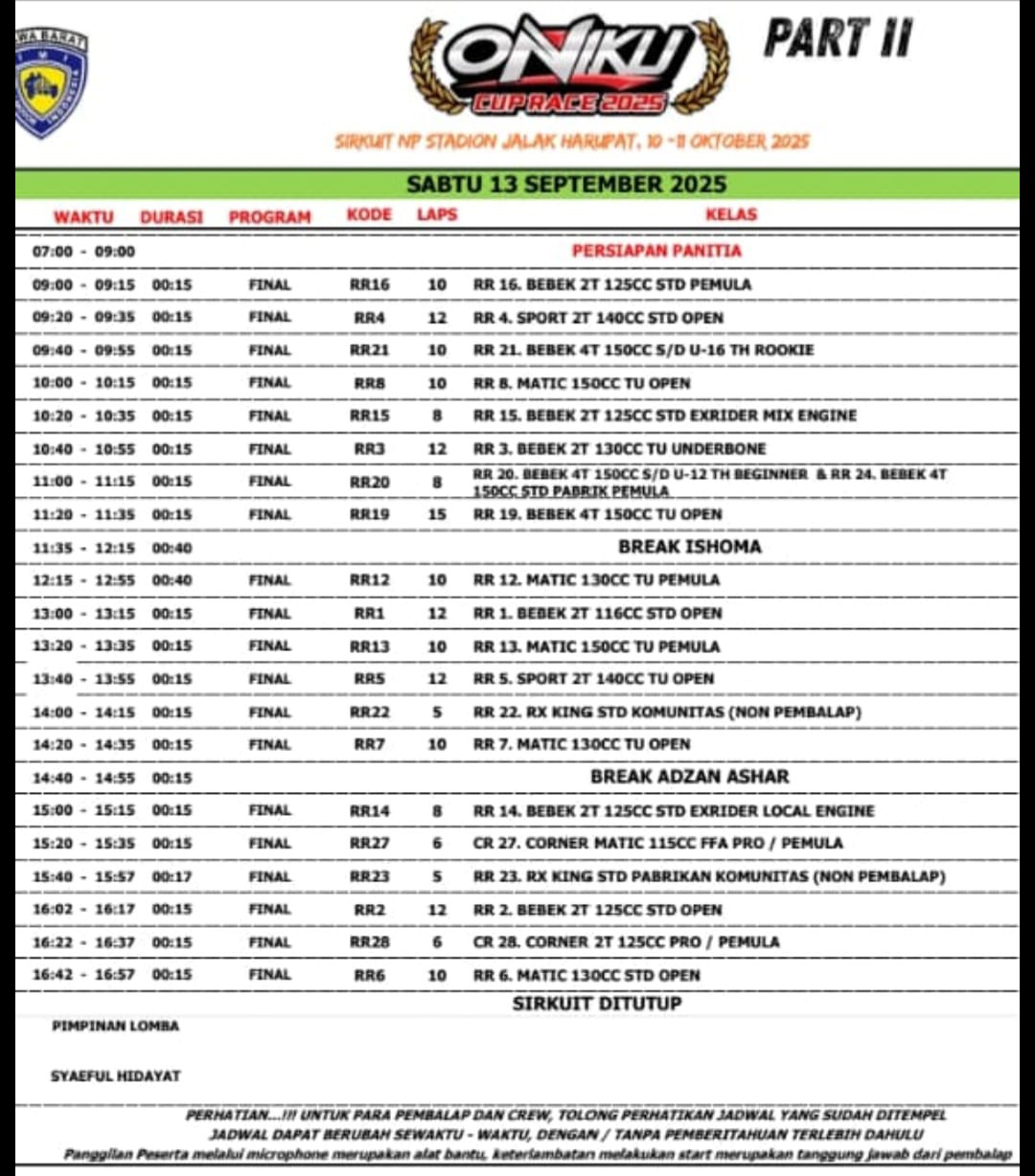 “Setiap kelas hari ini benar-benar menegangkan. Para pembalap tampil maksimal dan adu strategi luar biasa. Ini jadi salah satu seri paling seru sepanjang penyelenggaraan ONIKU Cup,” ujar Ketua Panitia ONIKU Cup Race 2025.
