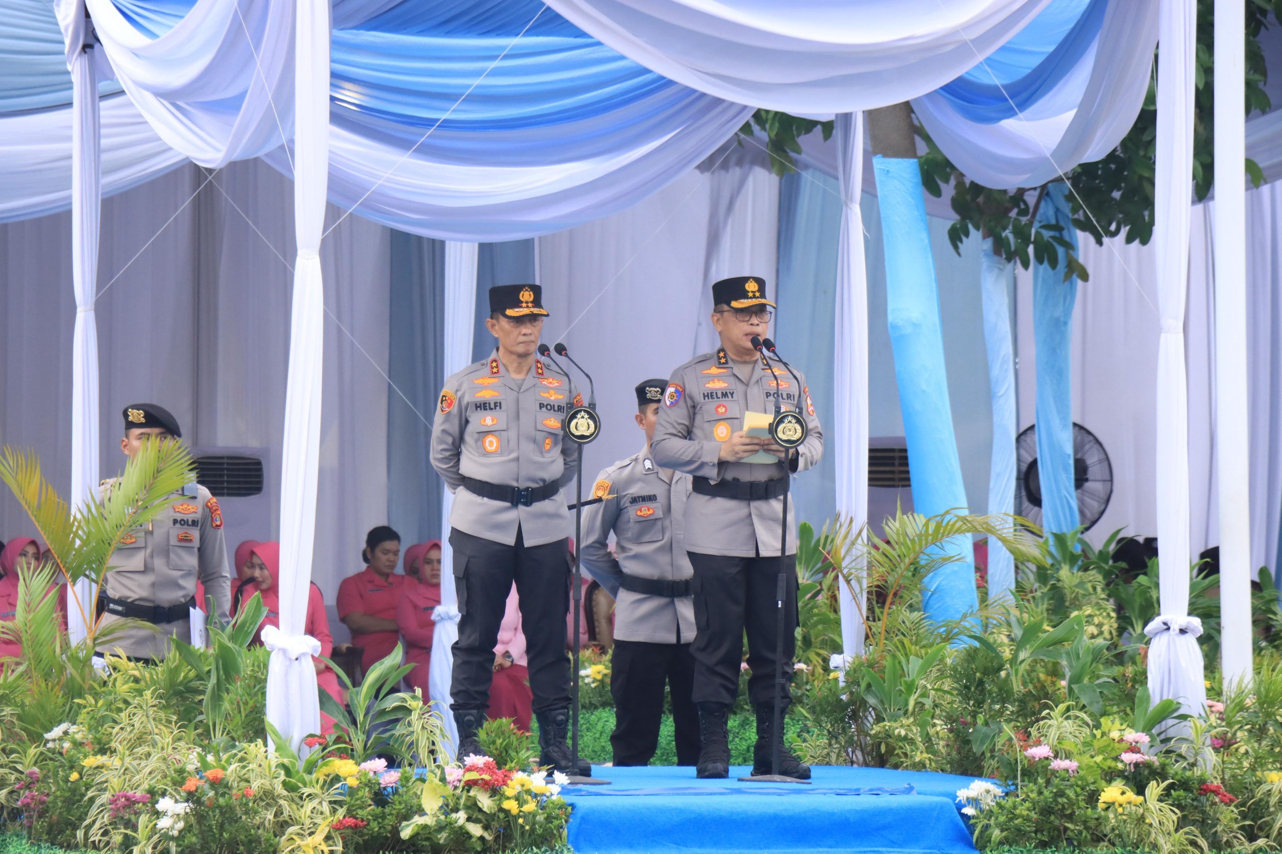 “kami menyampaikan selamat datang dan sambutan hangat yang penuh hormat kepada Bapak Irjen Pol Helfi Assegaf sebagai Kapolda Lampung yang baru. Tradisi penyambutan yang khidmat dan sakral ini merupakan wujud komitmen serta kesiapan seluruh personel Polda Lampung untuk mendukung penuh kepemimpinan Bapak Kapolda yang baru,”