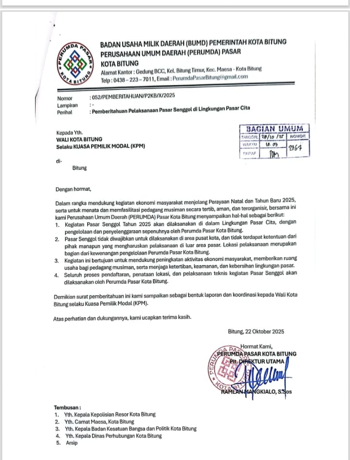 Surat Nomor: 052/PEMBERITAHUAN/P2KB/X/2025 Perihal: Pemberitahuan Pelaksanaan Pasar Senggol di Lingkungan Pasar Cita, tertanggal 22 Oktober 2025 tapi diterima Pemkot tanggal 29 Oktober 2025 yang ditandatangani Plt. Direktur Utama Ramlan Mangkialo, S.Sos, yang ditujukan Kepada Walikota Bitung selaku Kuasa Pemilik Modal (KPM) menyebutkan bahwa pelaksanaan Pasar Senggol sepenuhnya berada dalam kendali Perumda, dan tidak boleh dilakukan di luar area pasar.