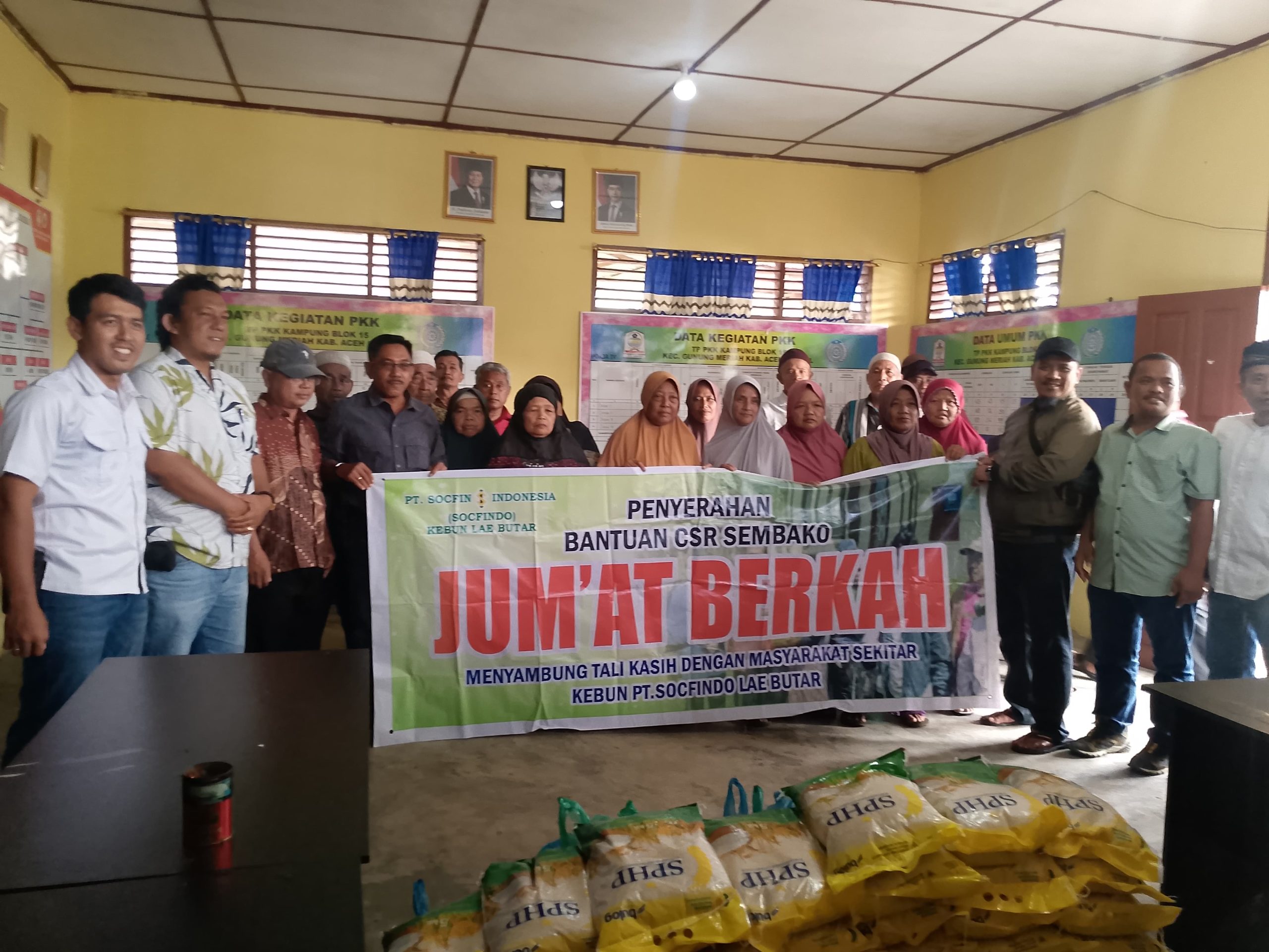 PT Socfindo Kebun Lae Butar kembali melaksanakan kegiatan Jumat Berkah dengan membagikan paket sembako kepada warga yang bermukim di sekitar perusahaan.