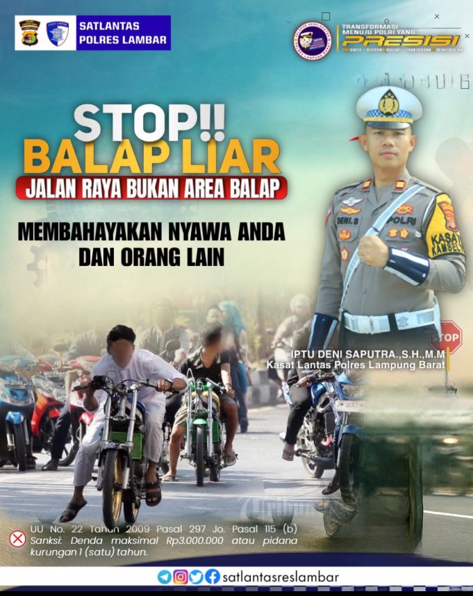 Kapolres Lampung Barat AKBP Rinaldo Aser, SH, SIK, MSI. Melalui, Kasat Lantas Polres Lampung Barat IPTU Deni Saputra,SH,MM., menegaskan pihaknya tidak akan memberi toleransi terhadap pengendara yang kedapatan melakukan balap liar. Penindakan ini sejalan dengan aturan tegas dalam Pasal 297 Undang-Undang Nomor 22 Tahun 2009 tentang Lalu Lintas dan Angkutan Jalan (LLAJ).