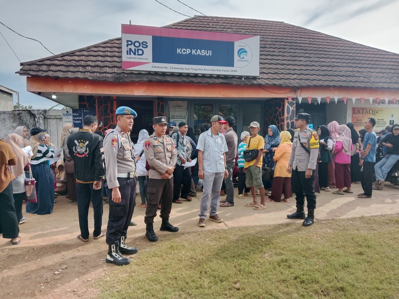 Polsek Kasui Polres Way Kanan melakukan pengamanan dan monitoring kegiatan penyaluran bantuan langsung tunai sementara kesejahteraan rakyat (BLTS Kesra) di Kantor Pos 34765 Cabang Kasui, Kampung Jaya Tinggi, Kecamatan Kasui Kabupaten Way Kanan. Jum’at (28/11/2025)