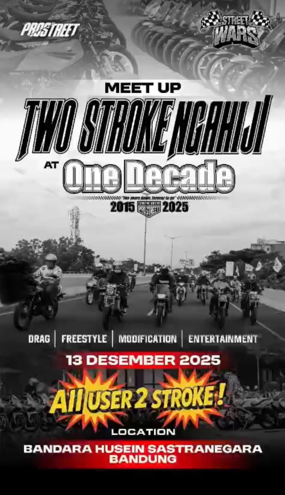 Bandung – Event drag race STREET WARS ONE DECADE berlangsung sangat meriah dan penuh gengsi. Ajang yang mempertemukan para pecinta balap lurus ini menyajikan persaingan ketat antar tim, dengan atmosfer kompetisi yang menjunjung tinggi sportivitas dan adu strategi.Sabtu 13 Desember 2025