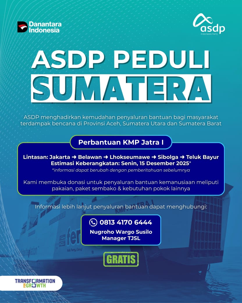 Seiring pengerahan KMP Jatra I, ASDP juga membuka fasilitas penyaluran bantuan kemanusiaan secara gratis bagi masyarakat, korporasi, dan institusi yang ingin turut berkontribusi dalam pemulihan bencana di Sumatera.