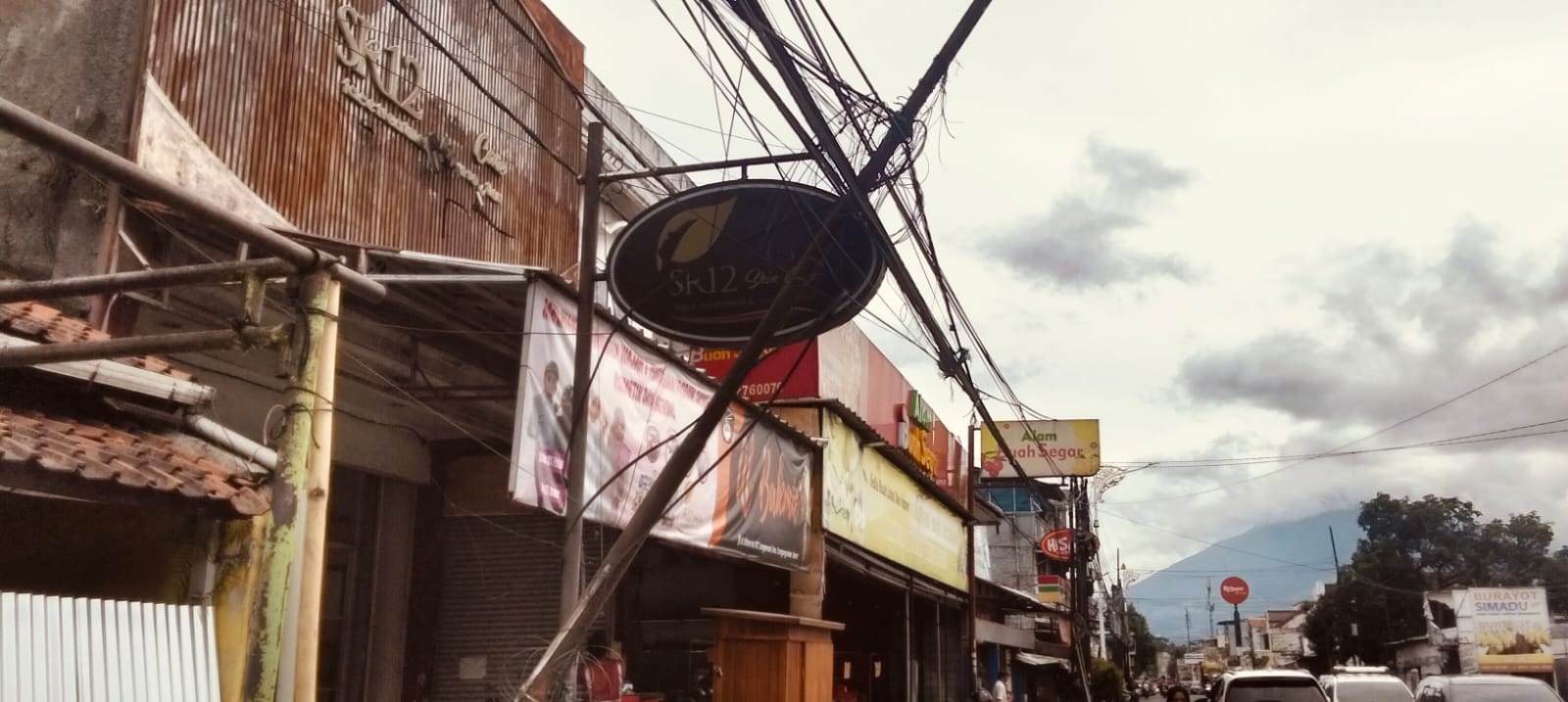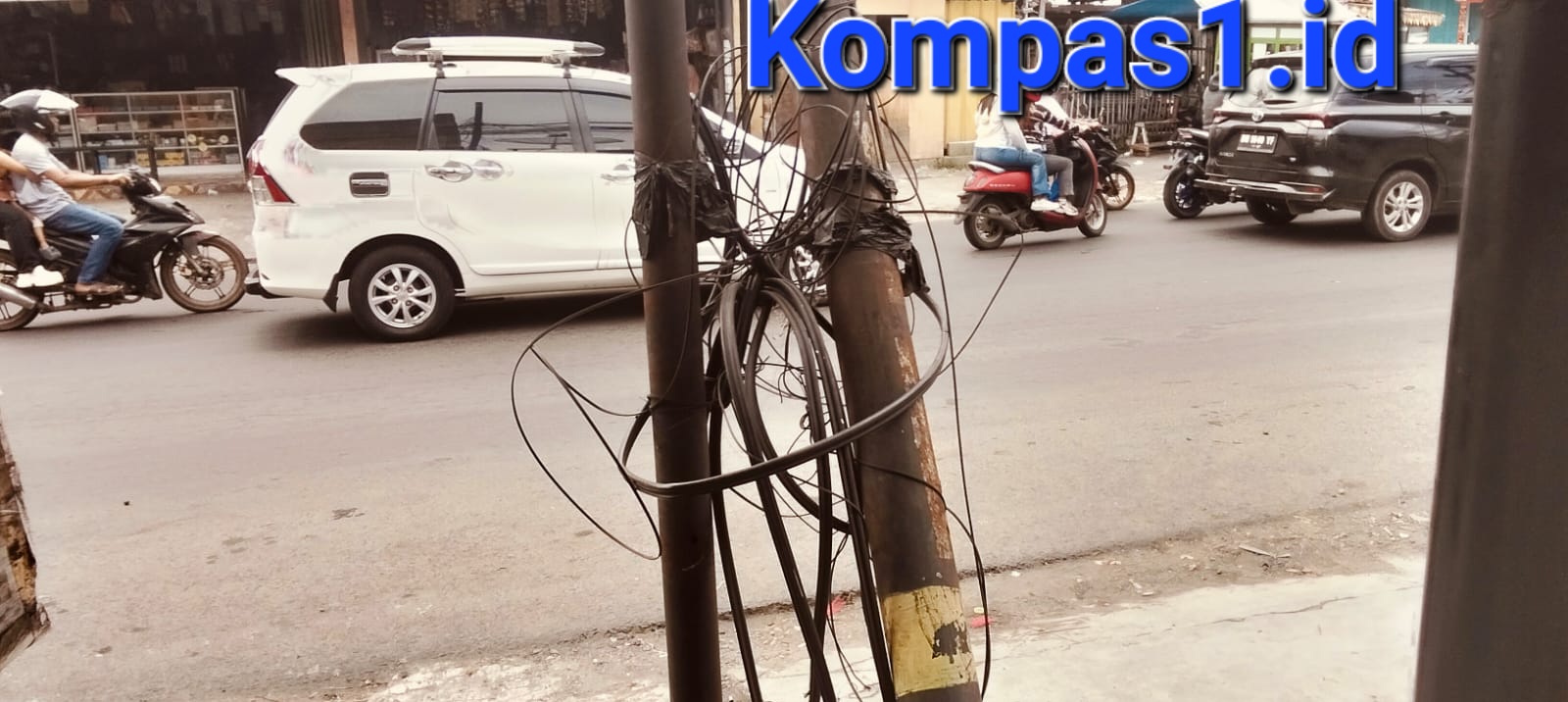 Semrawut Jaringan Internet, Tiang Miring Ancam Keselamatan Warga Pasar Kemis