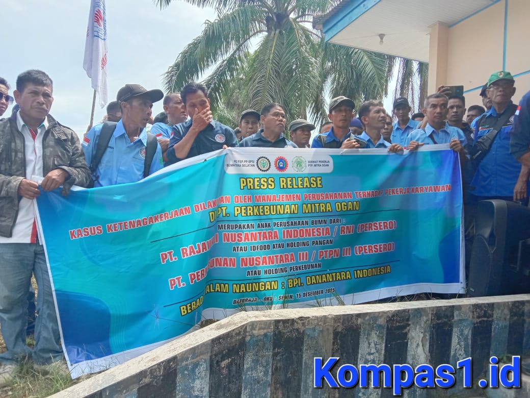 Ratusan pekerja yang tergabung dalam Federasi Serikat Pekerja Perkebunan dan Kehutanan (FSP PP–SPSI) Provinsi Sumatera Selatan menggelar aksi penyampaian aspirasi dan press release terkait kasus ketenagakerjaan di PT Perkebunan Mitra Ogan (PTP Mitra Ogan), anak perusahaan BUMN di bawah PT Rajawali Nusantara Indonesia (RNI) Persero, Senin (15/12/2025).