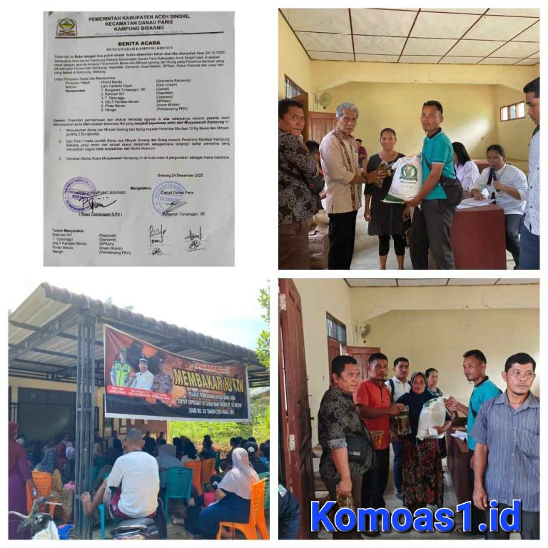 Distribusi bantuan pangan akhir tahun di Desa Biskang, Kecamatan Danau Paris, Kabupaten Aceh Singkil, dilaksanakan pada Rabu, 24 Desember 2025. Penyaluran bantuan tersebut disambut dengan penuh rasa syukur dan kebahagiaan oleh masyarakat karena dibagikan secara adil dan merata kepada seluruh penerima yang berhak.
