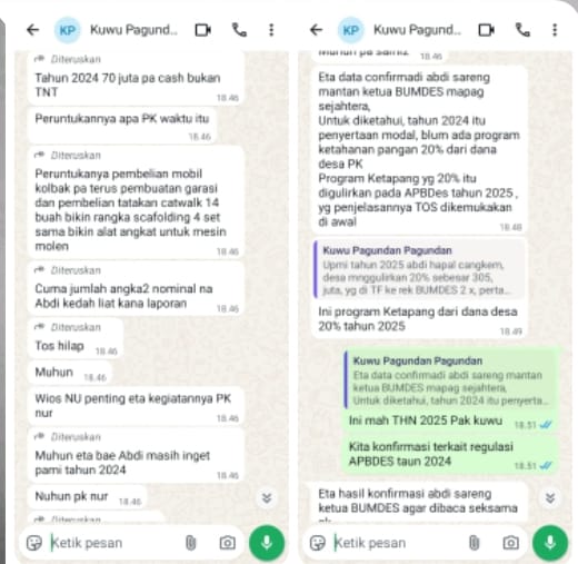 “Awak media pun mendatangi langsung ke kantor Desa Pagundan Kecamatan Lebak wangi namun kepala Desa dan Sekretaris Desa tidak ada di tempat sehingga awak media menghubungi via chating whattapp kepada Kepala Desa untuk mengkonfirmasi penggunaan Dana Desa 20% untuk ketahanan pangan dan kepala Desa tidak bisa menjawab serta melemparkan hak jawab konfirmasi ke Sekretaris Desa.