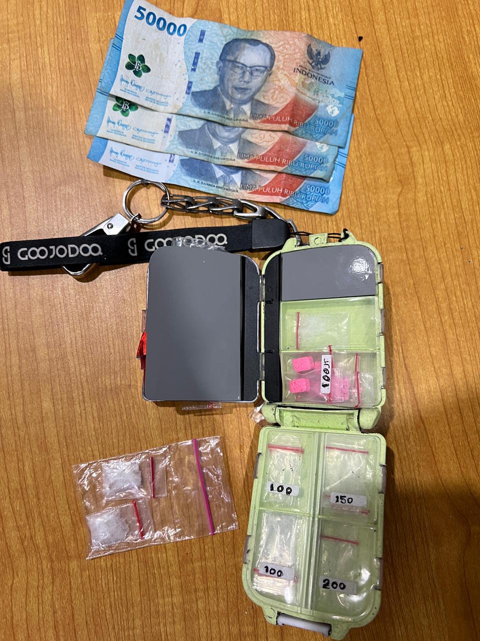 Saat dilakukan penggeledahan, petugas menemukan narkotika yang disimpan di kantong celana tersangka. Barang bukti yang disita meliputi sabu dengan berat bruto 4,56 gram, pil ekstasi berlogo LV warna merah muda beserta pecahannya dengan total berat bruto lebih dari 2 gram, uang tunai Rp150 ribu, serta sebuah kotak hitam-hijau bertuliskan “NR” berikut gantungan kunci.