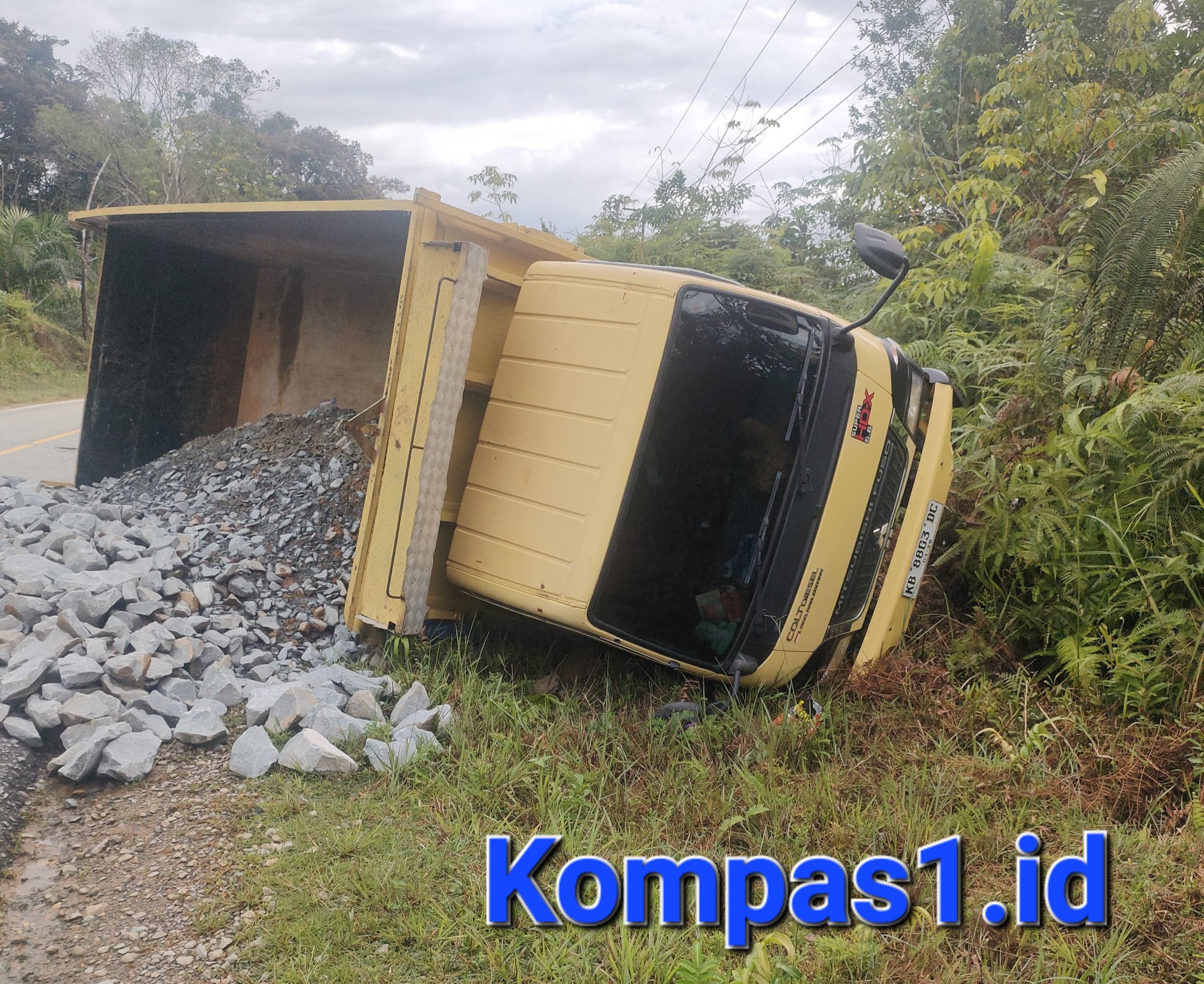 Akibat manuver tersebut, truk kehilangan kendali dan akhirnya mengalami kecelakaan. Tidak ada korban jiwa dalam peristiwa ini, namun kerugian material diperkirakan cukup besar. Selain itu, posisi truk dan muatan batu kerikil yang belum dievakuasi menimbulkan potensi bahaya baru bagi pengguna jalan lainnya.