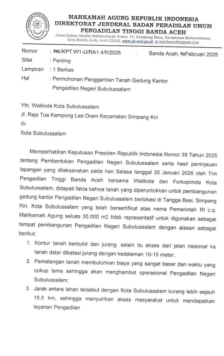Kota Subulussalam – Pengadaan lahan untuk pembangunan Pengadilan Negeri (PN) Subulussalam seluas 30.000 m2 di Desa Tangga Besi, Kecamatan Simpang Kiri, diduga bermasalah. Lahan tersebut ditolak oleh Pengadilan Tinggi (PT) Aceh karena tidak sesuai dengan perencanaan awal.
