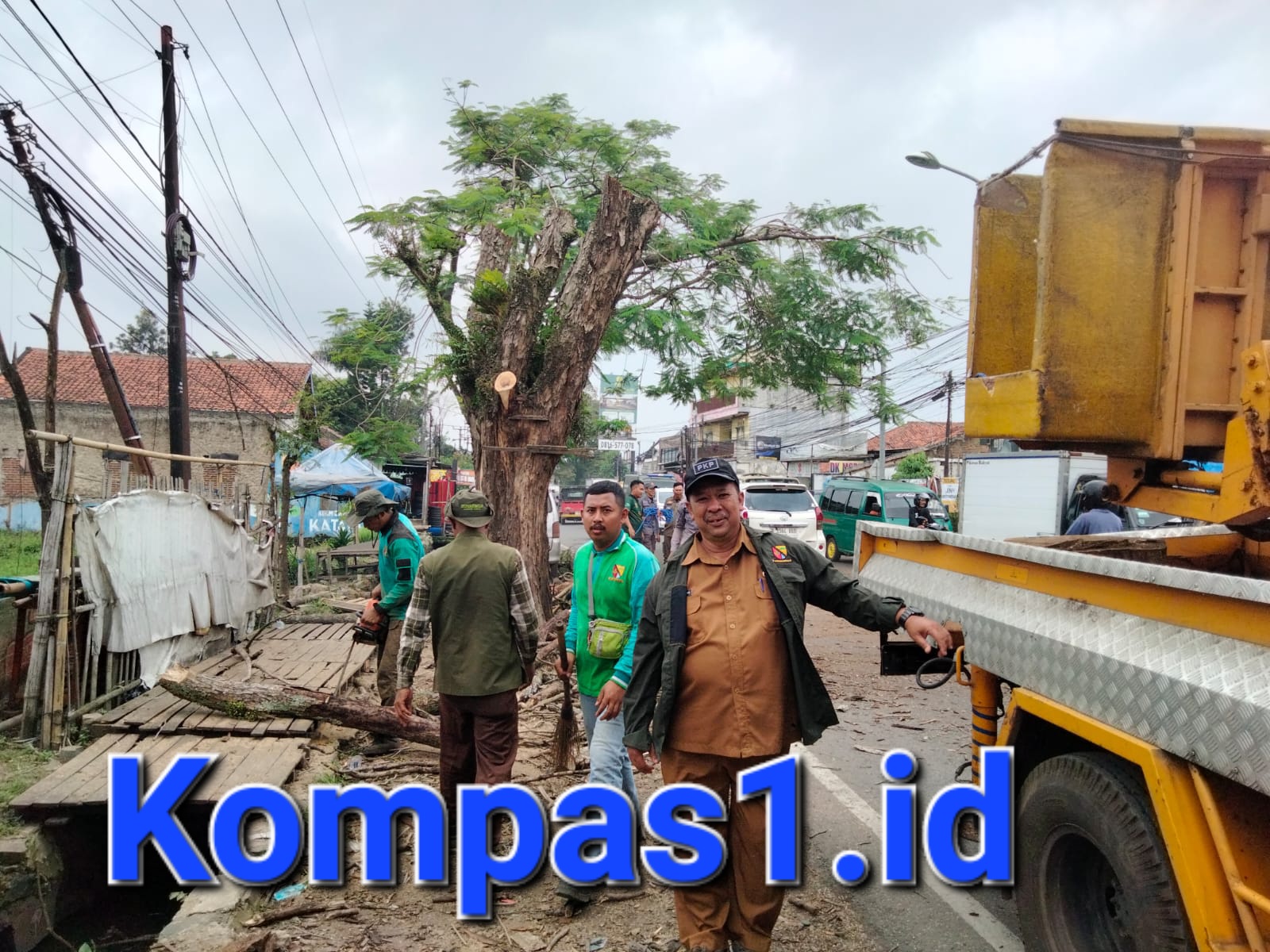 Unit Pelaksana Teknis Daerah (UPTD) Taman Dinas Perumahan, Kawasan Permukiman, dan Pertanahan (Disperkimtan) Kabupaten Bandung melakukan aksi respons cepat dengan melakukan penebangan pohon tua di sepanjang arus jalan provinsi wilayah jalan Soreang Bandung ( Katapang ).