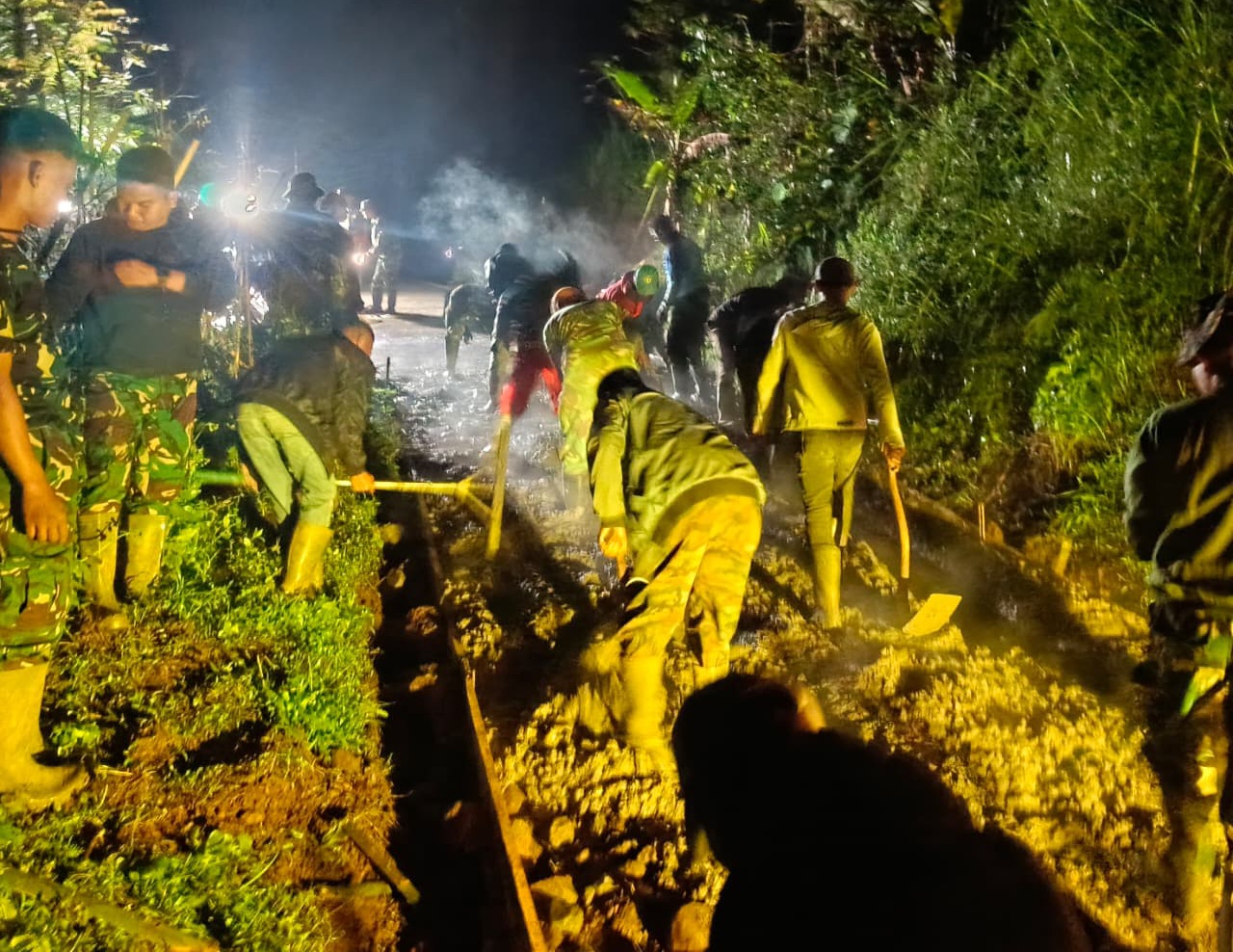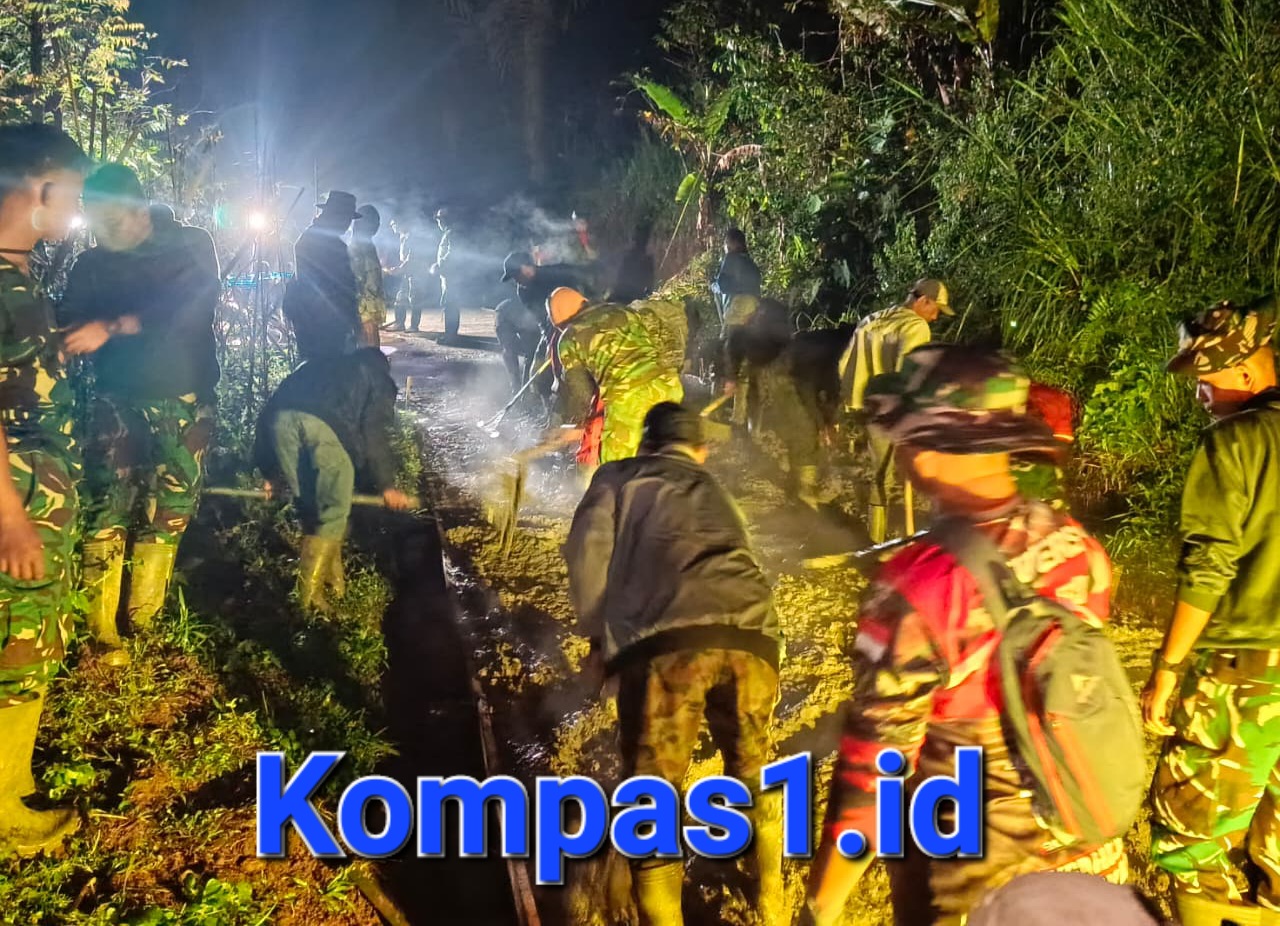 Satgas TMMD bersama masyarakat dengan penuh semangat melaksanakan pekerjaan siang dan malam hari guna mempercepat pencapaian sasaran fisik pengecoran hingga total 1.500 meter.