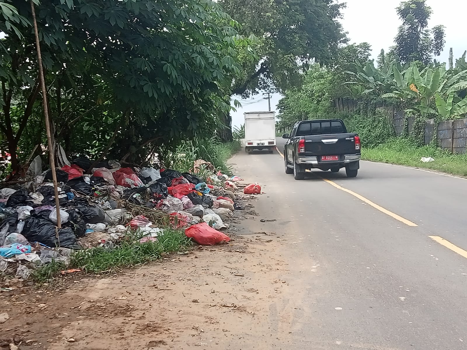Sampah tampak berserakan di sepanjang jalan desa dan menimbulkan bau tidak sedap serta mengganggu kenyamanan masyarakat yang melintas.
