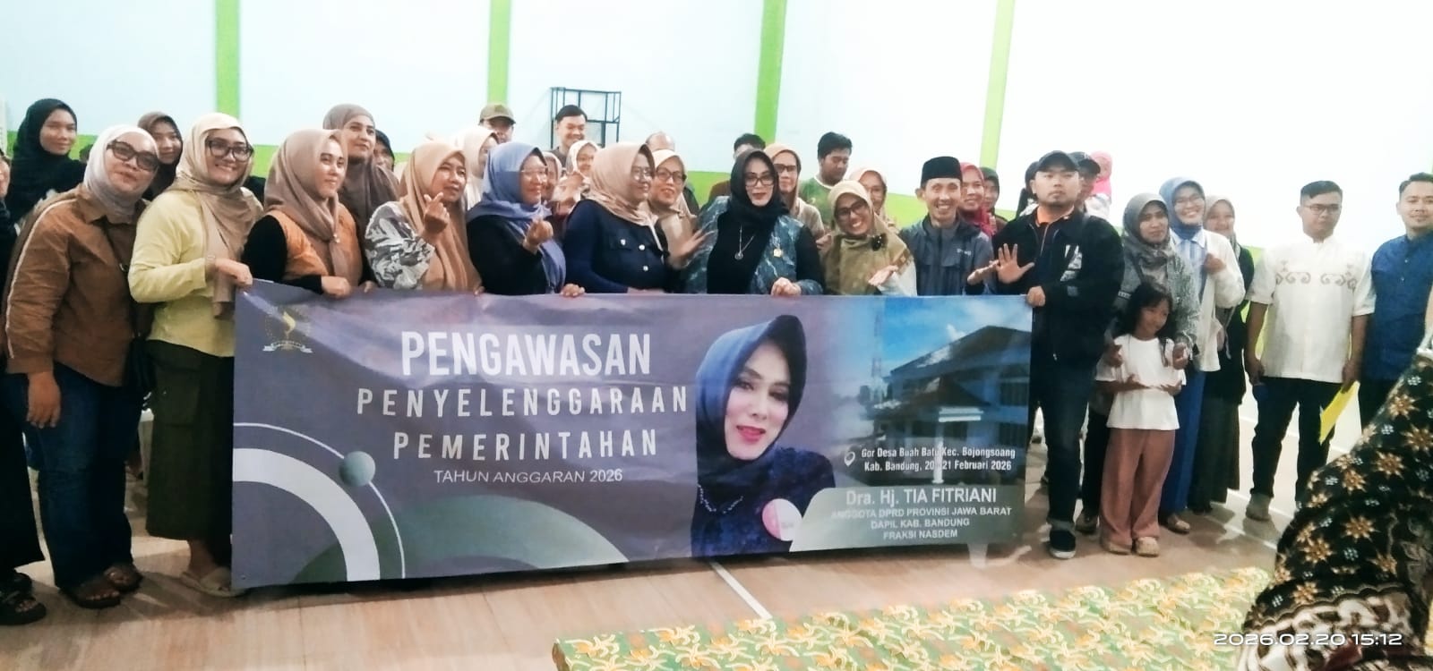 Agenda Kegiatan Pengawasan Penyelenggaraan Pemerintahan Tahun 2026 Kabupaten Bandung, Dra. Hj. Tia Fitriani, di dampingi Kepala Desa Buah Batu H. Asep Sobari. Evaluasi pelaksanaan program pemerintah provinsi, berlangsung di GOR Desa Buah Batu, Jalan Batusari No. 51 A, Kecamatan Bojongsoang, Kabupaten Bandung, Jumat, (20/02/2026)
