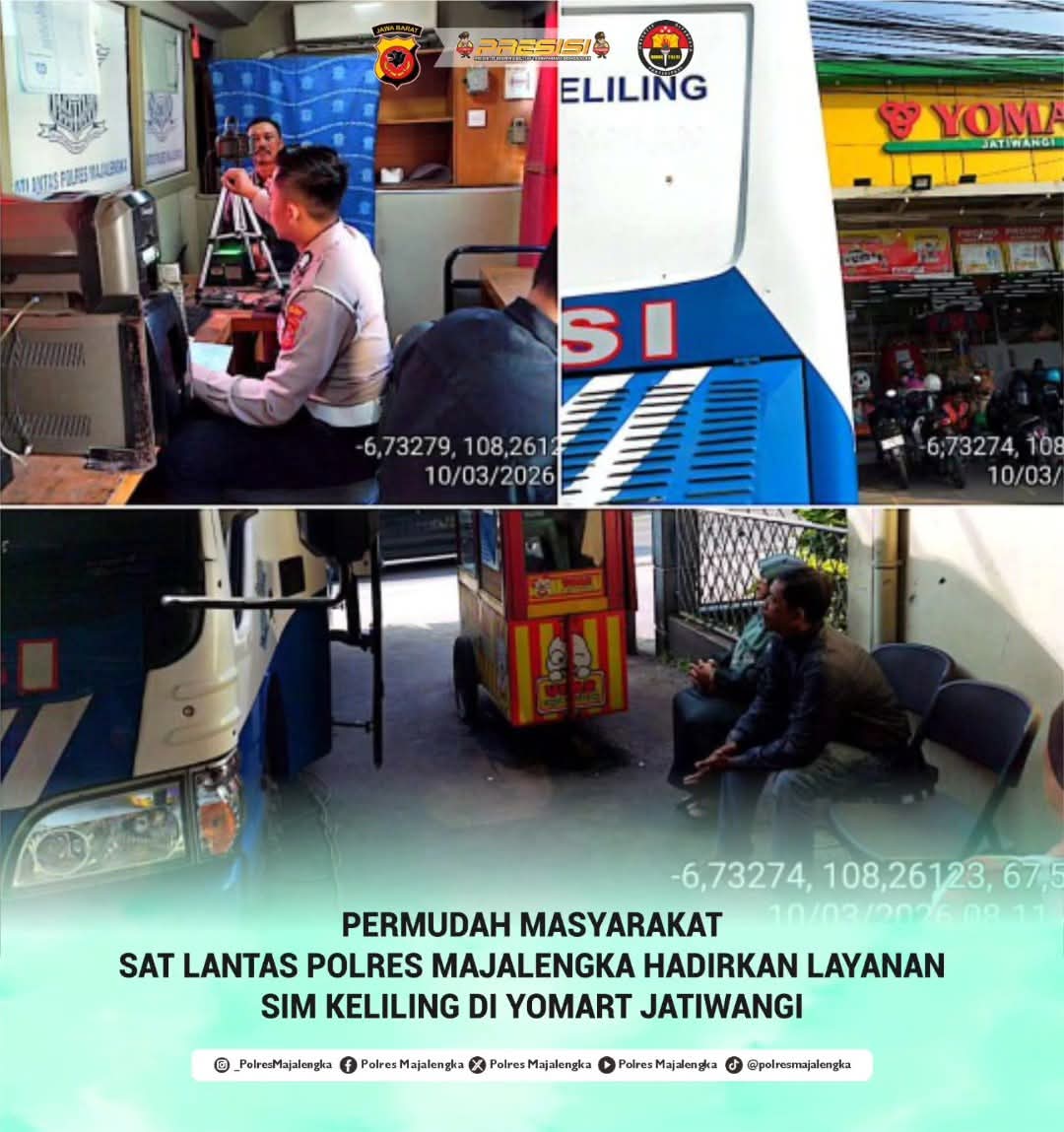 Majalengka,-KOMPAS1.id || Satuan Lalu Lintas (Sat Lantas) Polres Majalengka terus berkomitmen memberikan pelayanan prima dan kemudahan bagi masyarakat dalam pengurusan administrasi berkendara. Pada Rabu (11/3/2026), unit layanan SIM Keliling hadir menyapa warga di halaman Yomart Jatiwangi, Kecamatan Jatiwangi, Kabupaten Majalengka.