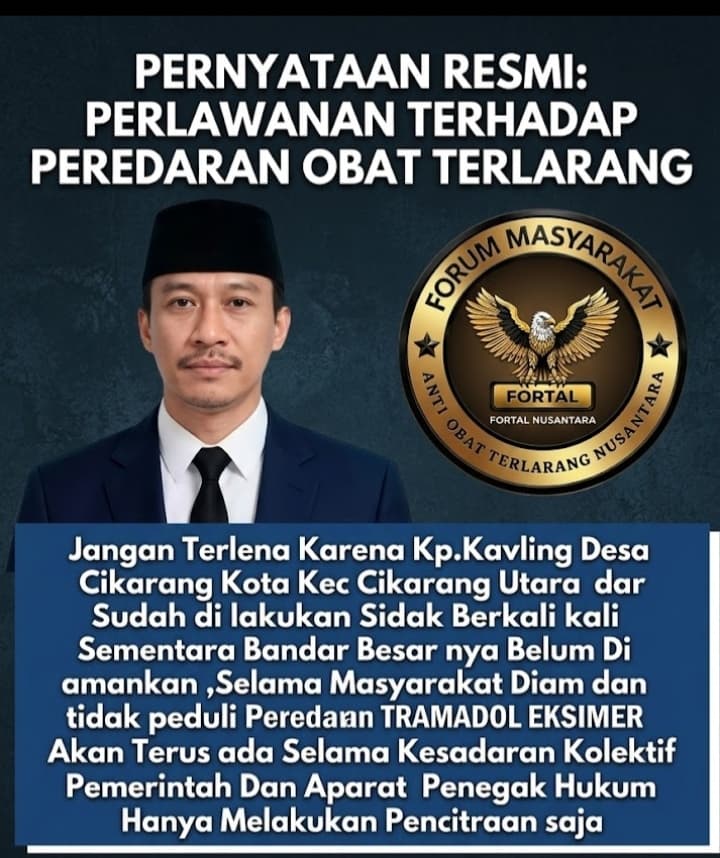Ketua Umum Forum Masyarakat Anti Obat Terlarang (FORTAL) Nusantara, Kang Edo, melontarkan kritik tajam terhadap minimnya peran sejumlah pihak di lingkungan Pemerintah Kabupaten Bekasi dalam upaya memberantas peredaran obat keras terlarang yang dinilai semakin meresahkan masyarakat.