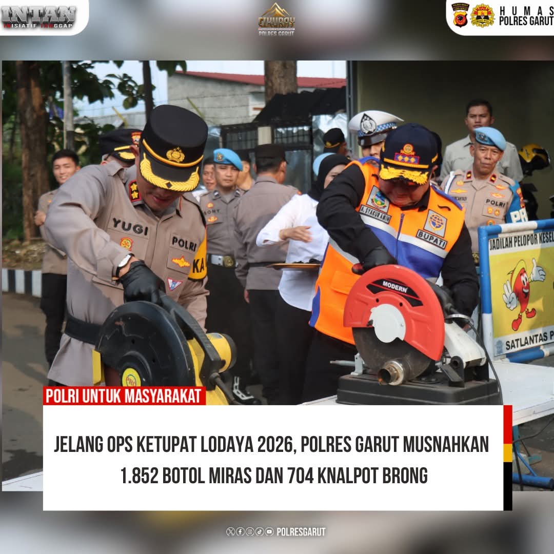 Garut –KOMPAS1.id || Menjelang pelaksanaan Operasi Ketupat Lodaya 2026, Polres Garut melaksanakan pemusnahan barang bukti hasil razia berupa ribuan botol minuman keras (miras) dan ratusan knalpot tidak sesuai spesifikasi teknis atau knalpot brong. Kegiatan tersebut dilakukan sebagai upaya menjaga situasi keamanan dan ketertiban masyarakat menjelang perayaan Idul Fitri. Kamis (12/3/2026).