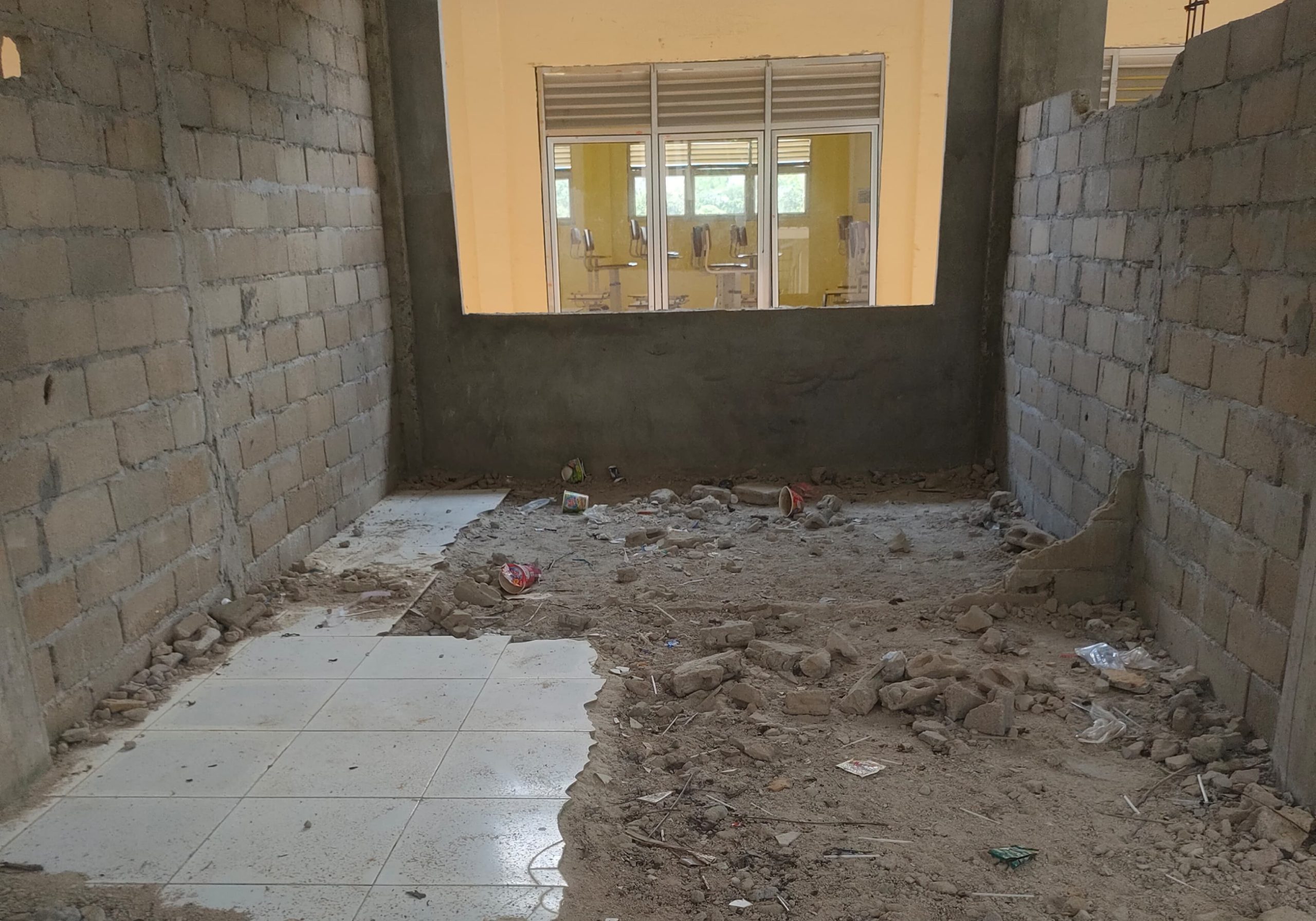 Berdasarkan pantauan langsung di lokasi, kondisi bangunan yang terlihat pada foto menunjukkan bahwa pembangunan belum selesai dan terkesan terbengkalai. Pada bagian dalam bangunan, terlihat lantai yang belum sepenuhnya terpasang keramik. Sebagian lantai masih berupa tanah bercampur puing-puing material bangunan seperti pecahan batu bata, plastik bekas, serta sisa material konstruksi yang berserakan. Hal ini mengindikasikan bahwa pekerjaan interior belum diselesaikan dan sudah cukup lama tidak dilanjutkan.
