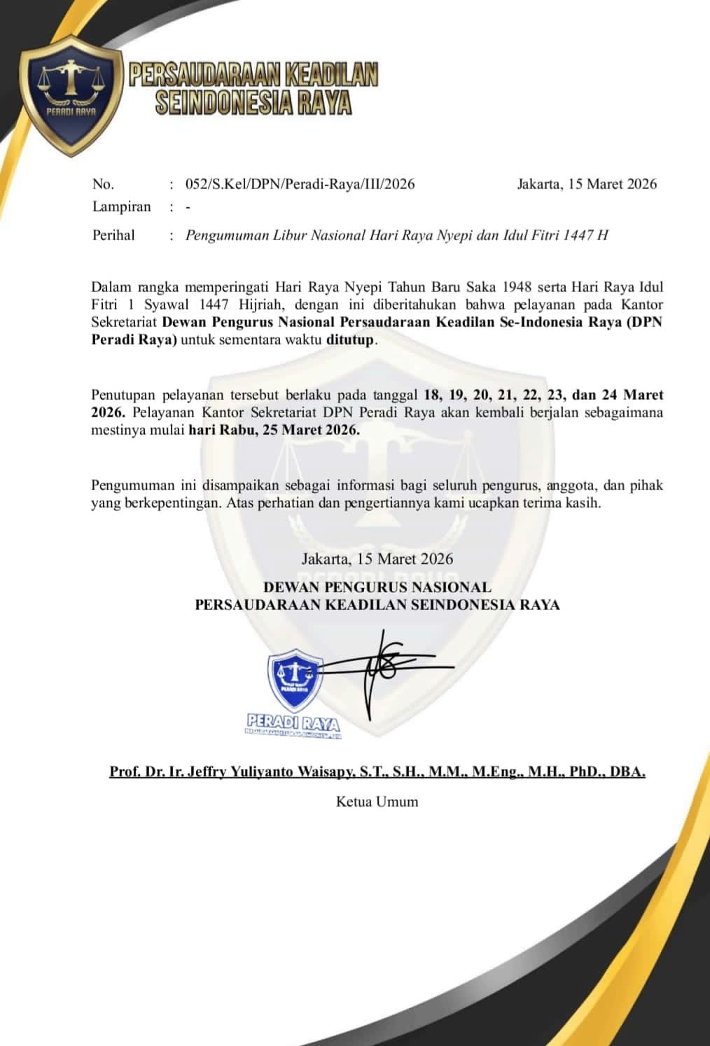 Dalam surat tersebut dijelaskan bahwa pelayanan pada Kantor Sekretariat DPN PERADI RAYA untuk sementara waktu ditutup mulai tanggal 18 hingga 24 Maret 2026. Penutupan ini dilakukan dalam rangka memperingati hari besar keagamaan nasional.