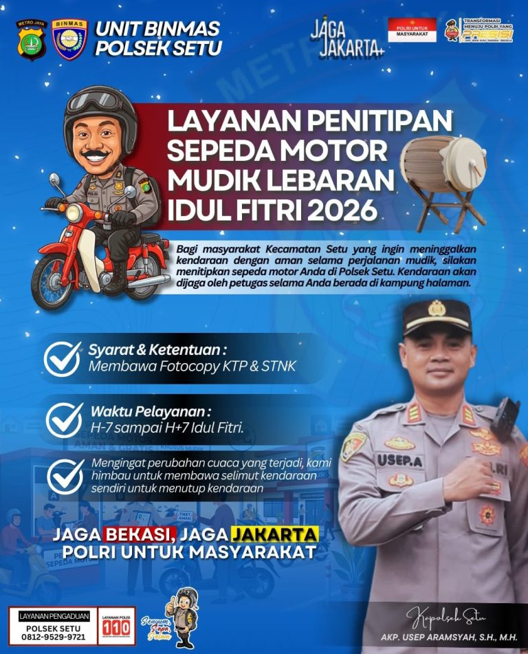 Polsek Setu, Polres Metro Bekasi membuka layanan penitipan kendaraan roda dua secara gratis bagi warga yang akan mudik Lebaran. Program ini bertujuan mencegah tindak kriminalitas, khususnya pencurian kendaraan bermotor, saat rumah ditinggalkan pemiliknya.