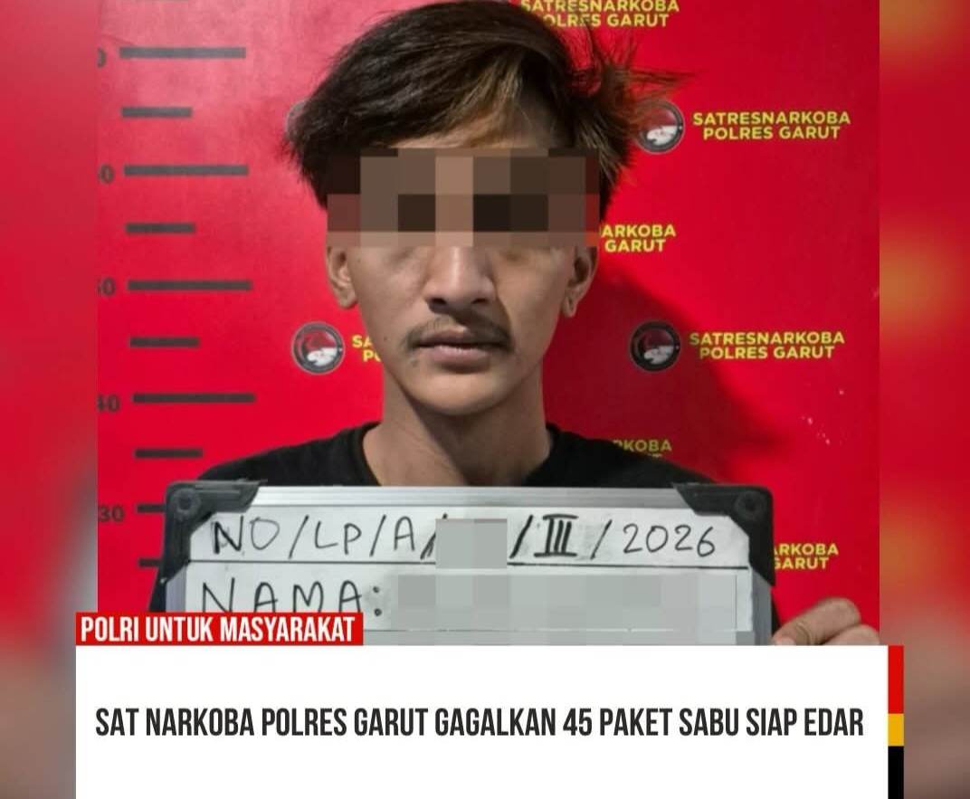 Kasat Narkoba AKP Usep Sudirman mengatakan penangkapan dilakukan pada Minggu, 15 Maret 2026 di kawasan Jalan RSU Dr. Slamet, Kecamatan Tarogong Kidul, Kabupaten Garut. Dari tangan pelaku, polisi berhasil mengamankan total 45 paket narkotika yang diduga jenis sabu dengan berat bruto 15,53 gram dan netto 6,53 gram.
