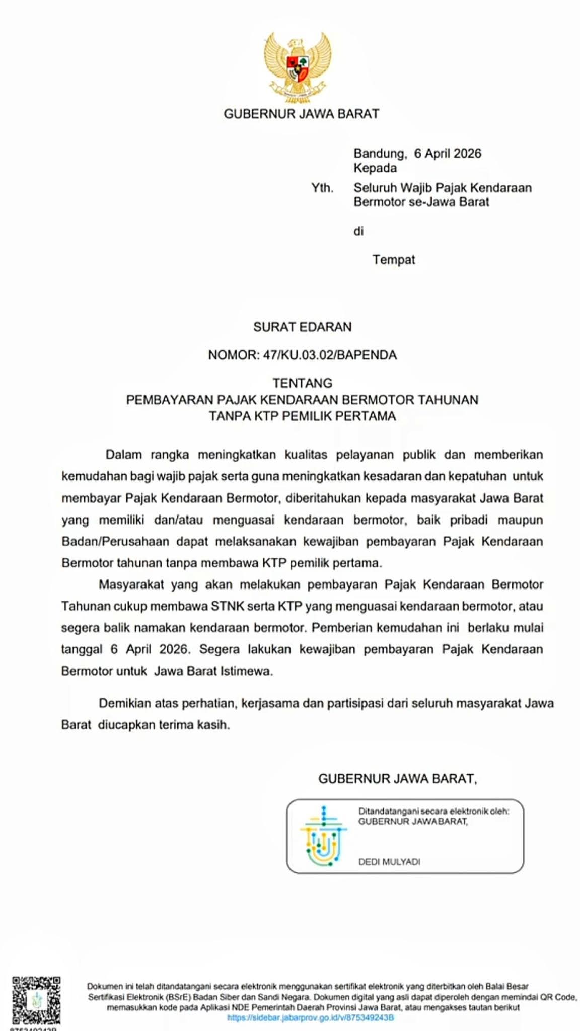 Kemudahan ini mulai berlaku sejak 6 April 2026 dan diharapkan mampu meningkatkan kesadaran serta kepatuhan masyarakat Jawa Barat dalam membayar pajak kendaraan bermotor.