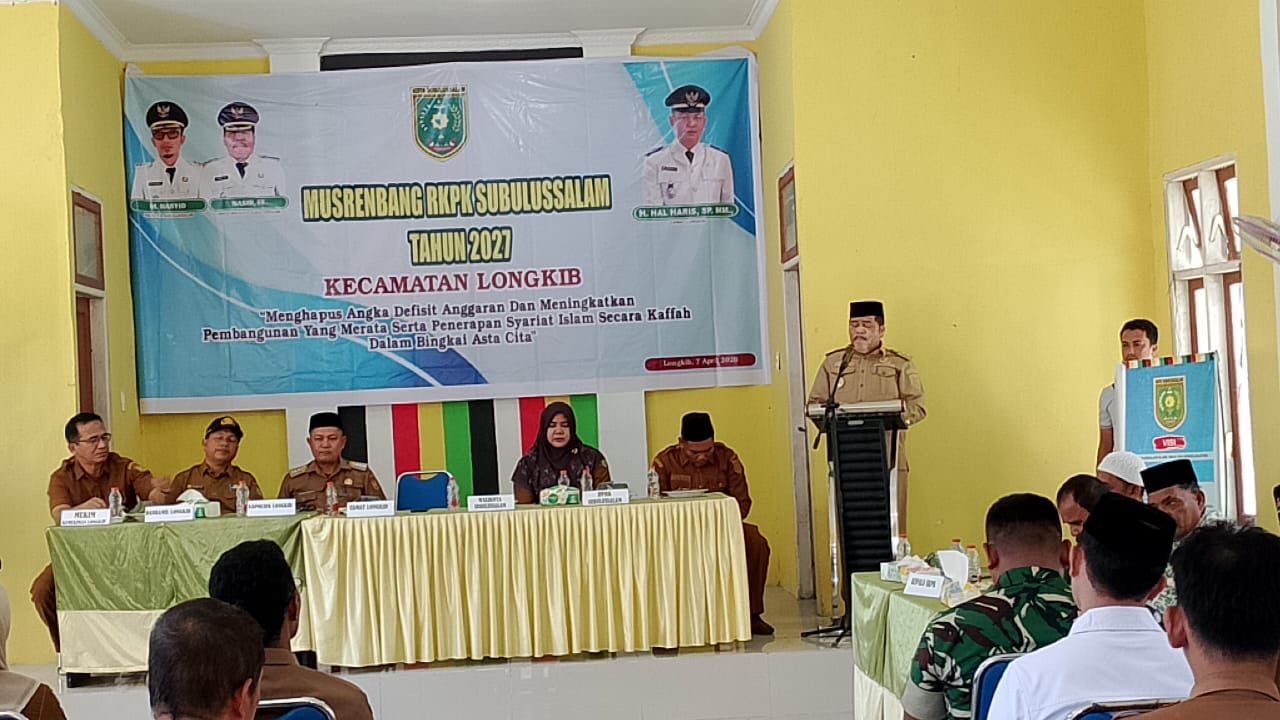 Subulussalam – Kecamatan Longkib melaksanakan Musrenbang tahun 2027 dengan tema “Menghapus Angka Defisit Anggaran dan Meningkatkan Pembangunan yang Merata serta Penerapan Syari’at Islam secara Kaffah dan Hikmah”. Acara ini dihadiri Wakil Walikota Subulussalam, Nasir Kombih, SE, serta beberapa kepala SKPK, termasuk Kepala Dinas PUPR, Kepala Dinas Pangan, dan Kepala Dinas Tenaga Kerja Kota Subulussalam.