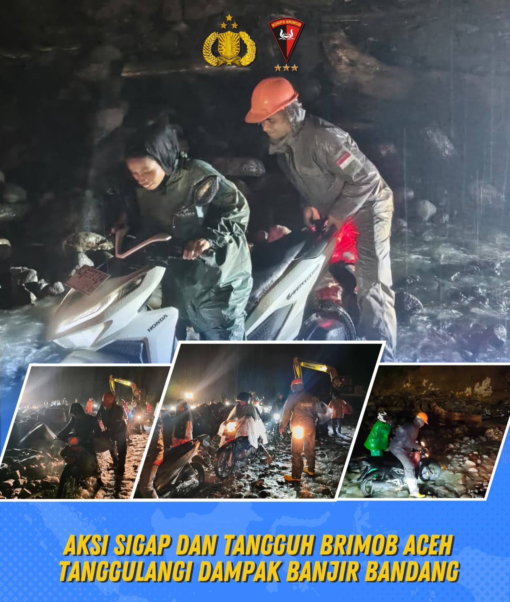 Personel 4 Batalyon D Pelopor Satuan Brimob Polda Aceh menunjukkan aksi cepat dan penuh dedikasi dalam merespons bencana banjir bandang yang mengakibatkan terputusnya jalan alternatif Bireuen–Takengon, tepatnya di Desa Wih Porak, Kecamatan Pintu Rime Gayo, Kabupaten Bener Meriah.