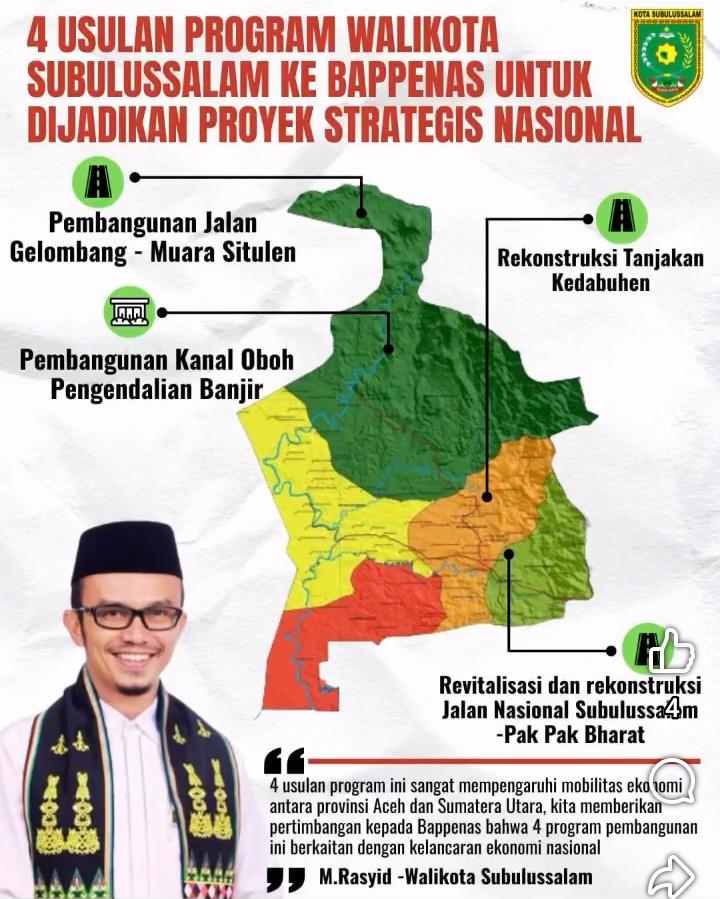 Subulussalam – Walikota Subulussalam, Haji Rasyid Bancin (HRB), mengusulkan 4 program untuk dijadikan Proyek Strategis Nasional (PSN) saat menemui Kepala BAPPENAS. Program-program tersebut adalah: