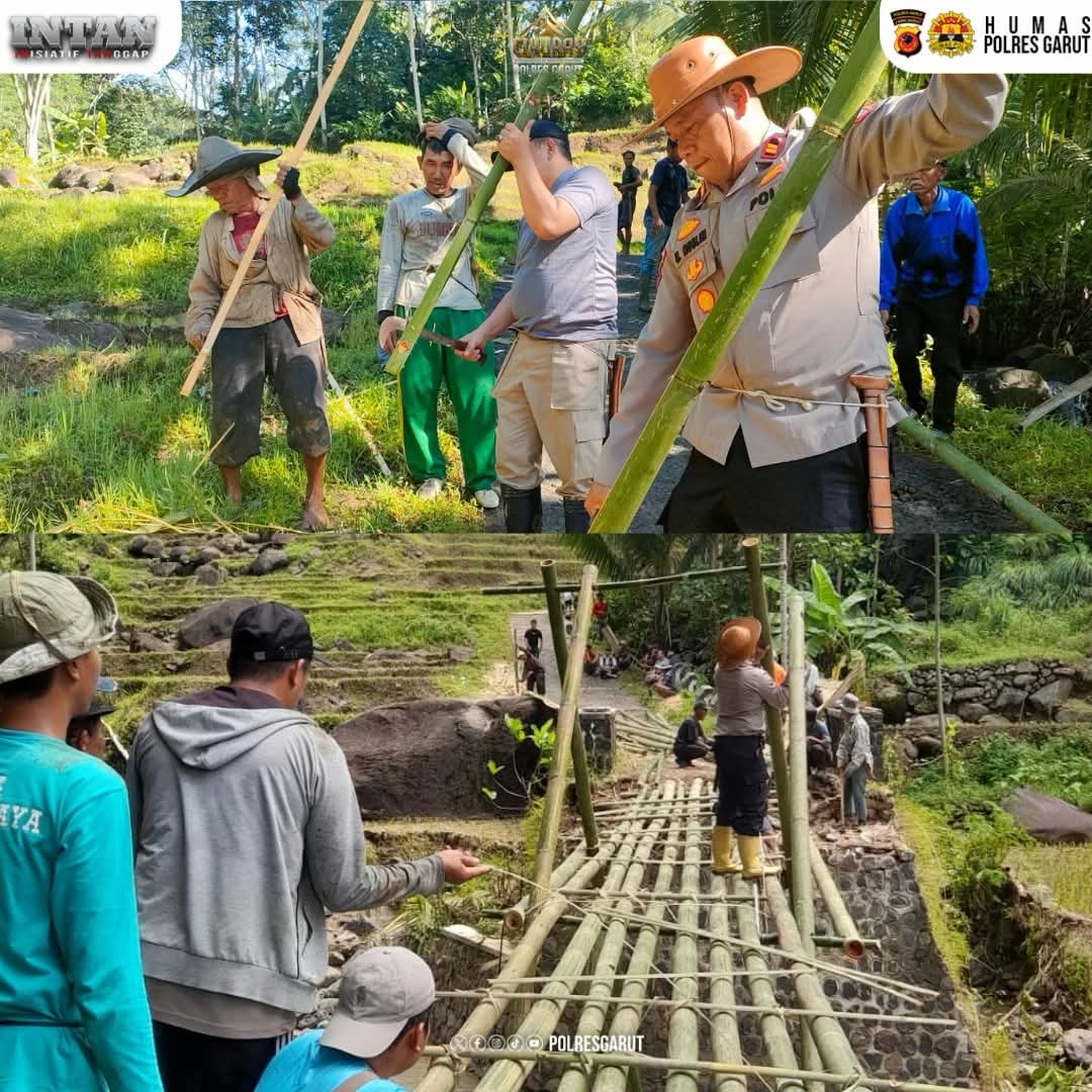 Polres Garut bersama Polsek Pakenjeng, unsur Forkopimcam dan masyarakat melaksanakan kegiatan kerja bhakti pembangunan jembatan darurat sebagai penghubung Desa Pasirlangu dan Desa Tanjung Jaya yang sebelumnya terputus akibat hujan deras.