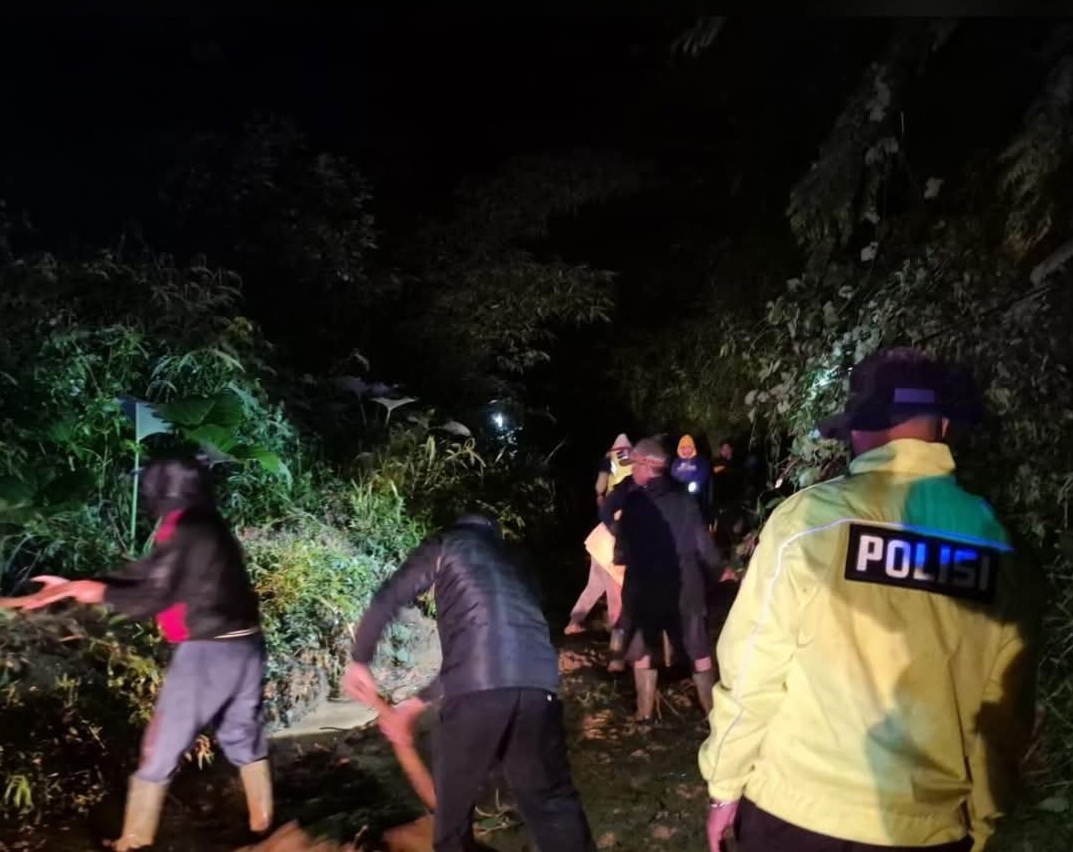 Polsek Banjarwangi bergerak cepat melakukan pengecekan tempat kejadian perkara (TKP) sekaligus mitigasi bencana alam tanah longsor yang terjadi di jalur Banjarwangi–Singajaya, tepatnya di Kampung Ciawitali, Desa Tanjungjaya, Kecamatan Banjarwangi, Kabupaten Garut, Sabtu (11/4/2026) malam.