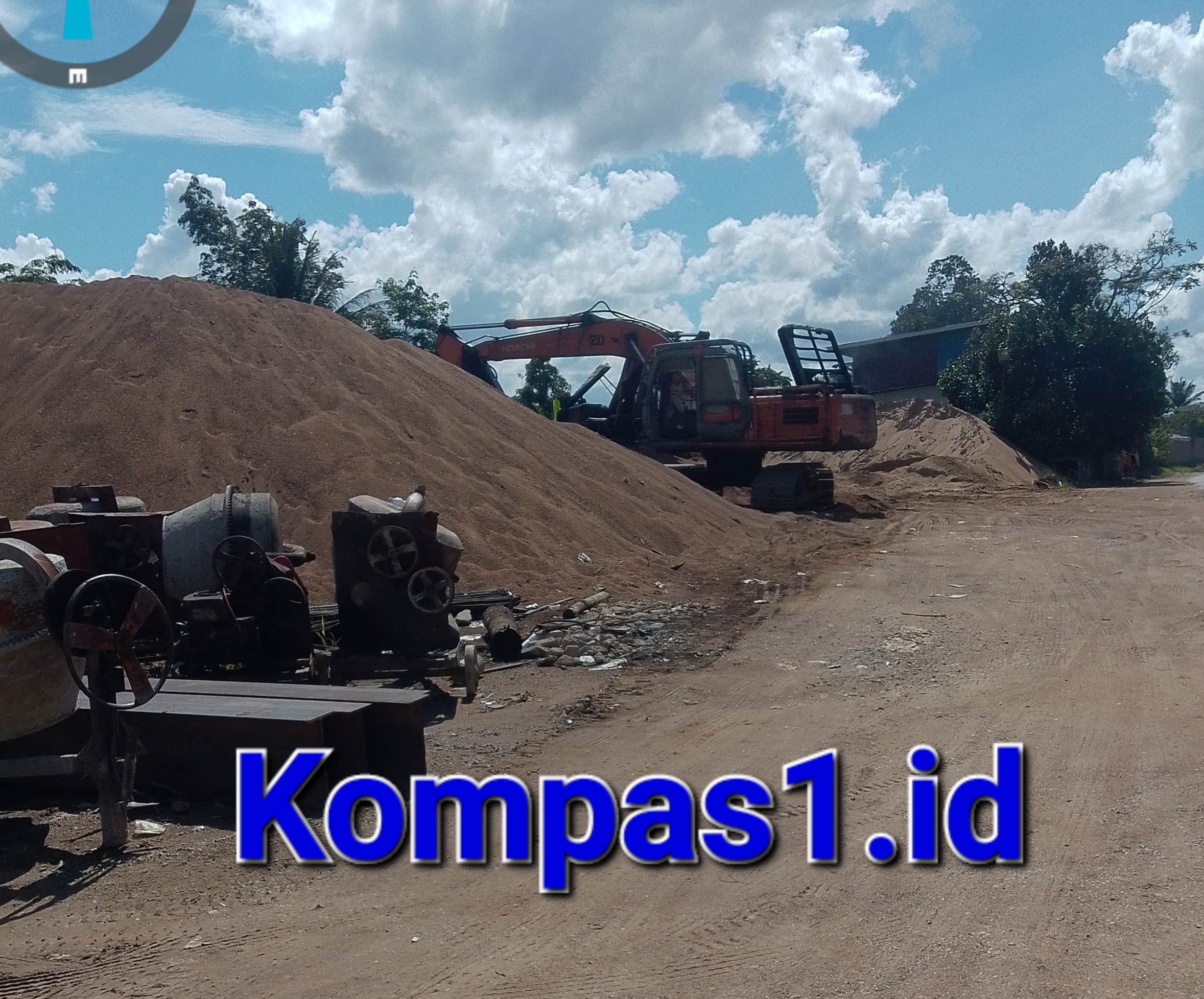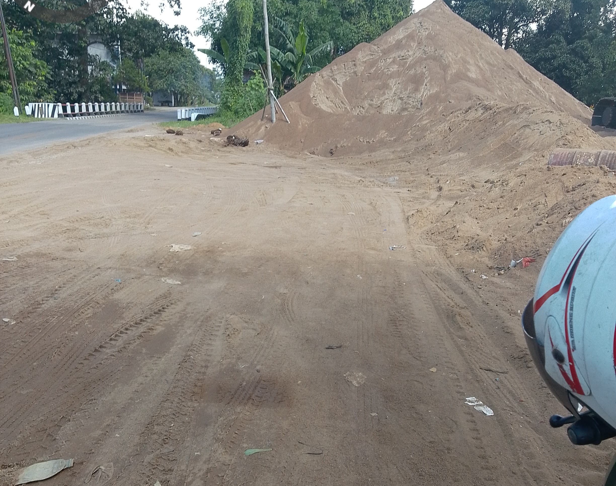 Berdasarkan pantauan di lokasi pada 11 April 2026 sekitar pukul 13.59 hingga 14.09 WIB, terlihat gundukan pasir dalam jumlah besar berada di sisi jalan utama. Selain itu, aktivitas alat berat seperti excavator juga tampak beroperasi di area tersebut. Kondisi jalan yang berdebu dan sebagian tertutup material pasir membuat ruang lalu lintas menjadi sempit dan berisiko menimbulkan kecelakaan.