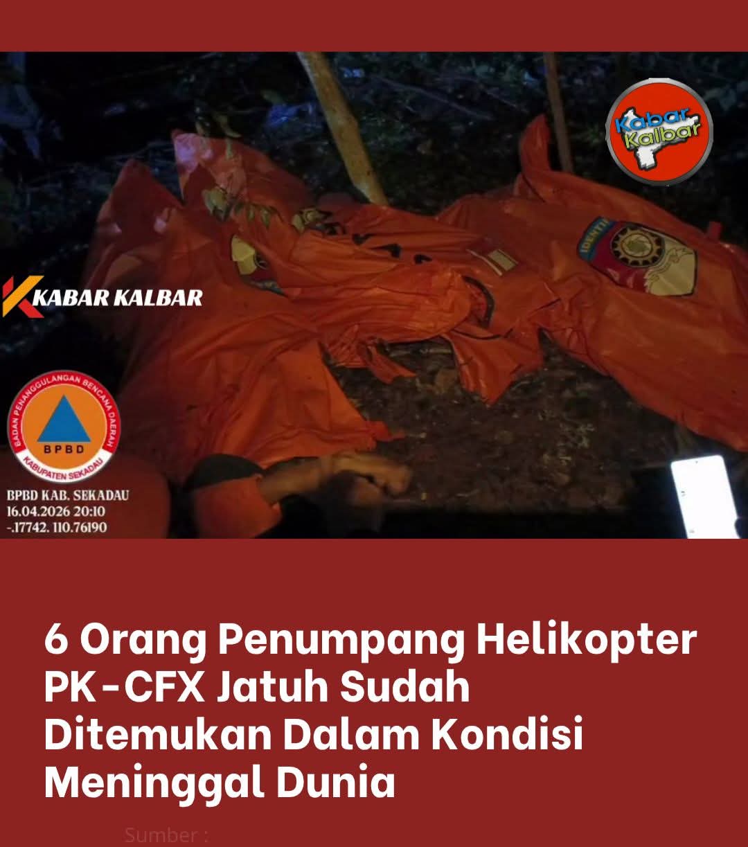 Kabar duka menyelimuti peristiwa jatuhnya helikopter dengan nomor registrasi PK-CFX yang terjadi di wilayah Kabupaten Sekadau, Kalimantan Barat. Setelah dilakukan pencarian intensif oleh tim gabungan, sebanyak enam orang penumpang dilaporkan telah ditemukan dalam kondisi meninggal dunia.