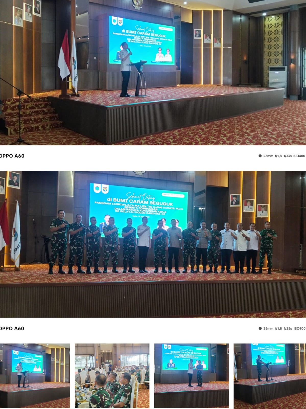 Bupati Ogan ilir Panca Wijaya Akbar, SH.,M.Si., M.I.Kom, bersama Forum Koordinasi Pimpinan Daerah (Forkopimda) Ogan Ilir menyambut kunjungan kerja Pangdam II/Sriwijaya, Ujang Darwis beserta rombongan ke wilayah Kodim 0402/OKI-OI, Rabu (15/04/2026).