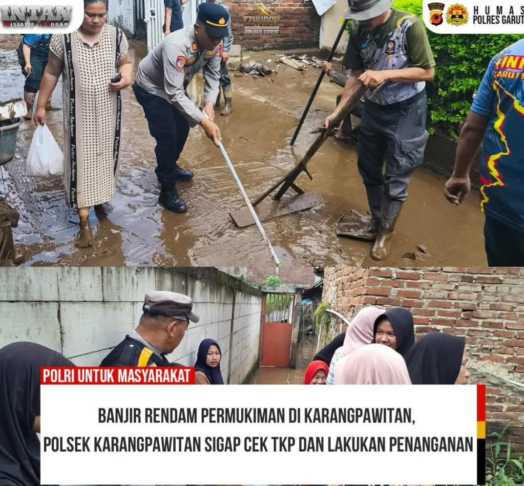 Banjir Rendam Permukiman di Karangpawitan, Polsek Karangpawitan Sigap Cek TKP dan Lakukan Penanganan
