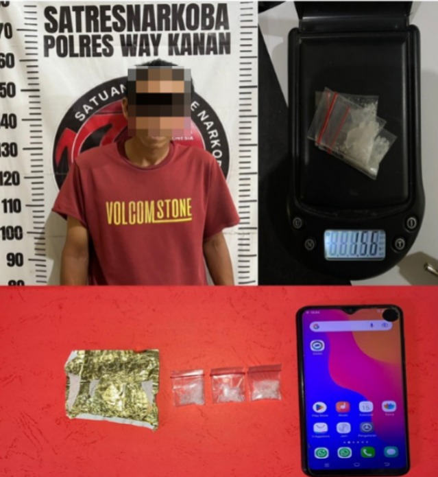 Saat ini tersangka berikut barang bukti kertas timah rokok, 3 (tiga) bungkus plastik klip ukuran kecil di dalamnya berisikan kristal putih yang diduga narkotika jenis sabu dengan *berat bruto 1,56 gram* dan Handphone warna Starry Black merek “Vivo Y91” diamankan ke Satresnarkoba Polres Way Kanan untuk dilakukan pemeriksaan lebih lanjut.