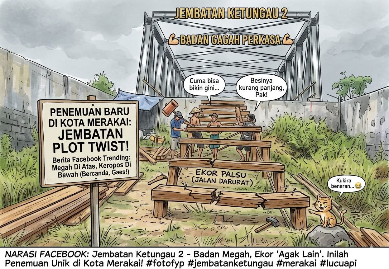 *Kalbar, Kompas1.Id* – Gambar sindiran tentang kondisi Jembatan Ketungau 2 yang viral di media sosial kini berubah menjadi jeritan hati masyarakat Kalimantan Barat. Di balik nuansa humor, tersimpan pesan mendalam: rakyat kecil mendambakan pembangunan yang benar-benar kokoh, aman, dan bermanfaat.