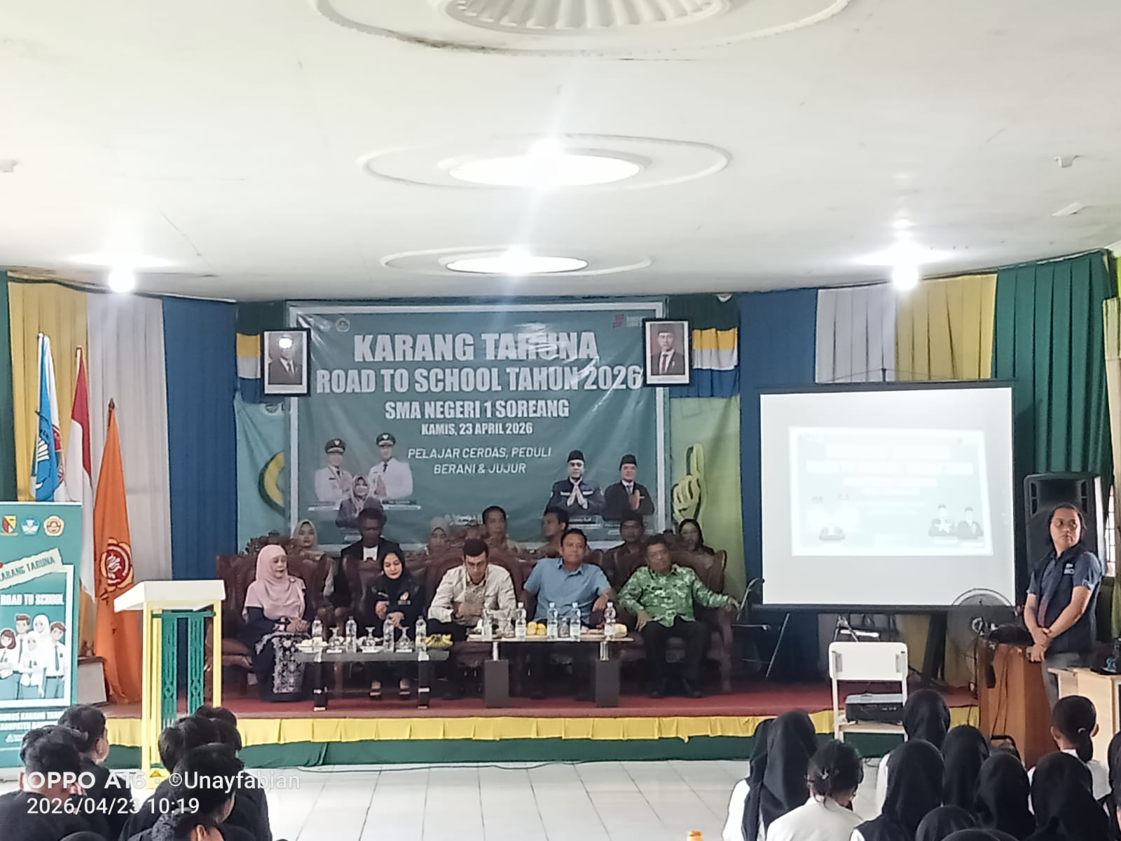 Bandung-Karang Taruna Kabupaten Bandung menggelar ” Road to School ” Tahun 2026 , dalam momentum ini di hadir Wakil Bupati Bandung Alie Syakib, Kepala Dinsos Nova , Camat Soreang Haris, Kepala Sekolah SMAN 1 Soreang Ida Fahmi Hidayati. L .S.Pd. ketua Karang Taruna Ruli Yuliana, S.H. beserta jajaran, kegiatan ini dalam rangka memperkenalkan Karang Taruna sebagai organisasi kepemudaan yang hadir di tengah masyarakat dan menjadi wadah pembinaan generasi muda, yang dilaksanakan di SMAN 1 Soreang , Kamis(23/4/2026).
