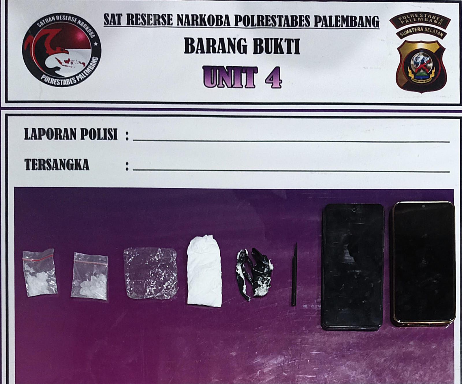 Seluruh tersangka beserta barang bukti kemudian diamankan ke Mapolrestabes Palembang untuk proses penyidikan lebih lanjut. Barang bukti yang disita meliputi dua bungkus sabu dengan berat bruto 5,02 gram, plastik klip kosong, alat bantu berupa sekop dari pipet plastik, serta dua unit telepon genggam yang diduga digunakan untuk komunikasi transaksi.