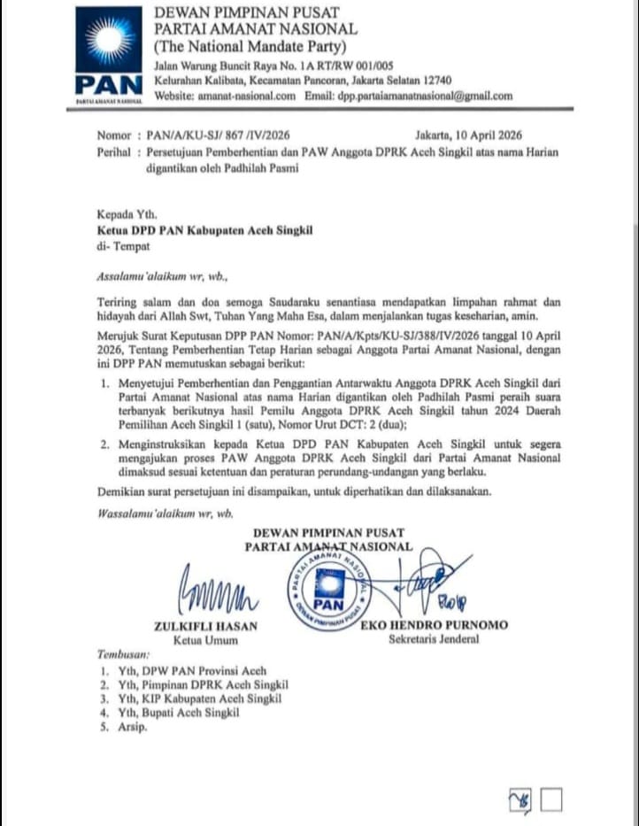 Dalam surat tersebut, DPP PAN yang ditandatangani oleh Ketua Umum Zulkifli Hasan dan Sekretaris Jenderal Eko Hendro Purnomo menyetujui pemberhentian tetap Harian sebagai anggota partai sekaligus anggota DPRK Aceh Singkil.