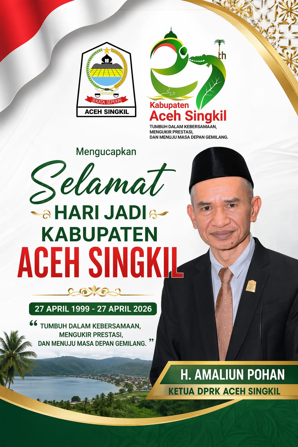 24 April 2026, Ketua DPRK Aceh Singkil, H. Amaliun Pohan, menyampaikan ucapan selamat Hari Jadi ke-27 Kabupaten Aceh Singkil yang diperingati pada 27 April 2026, bertepatan dengan tanggal berdirinya pada 27 April 1999.