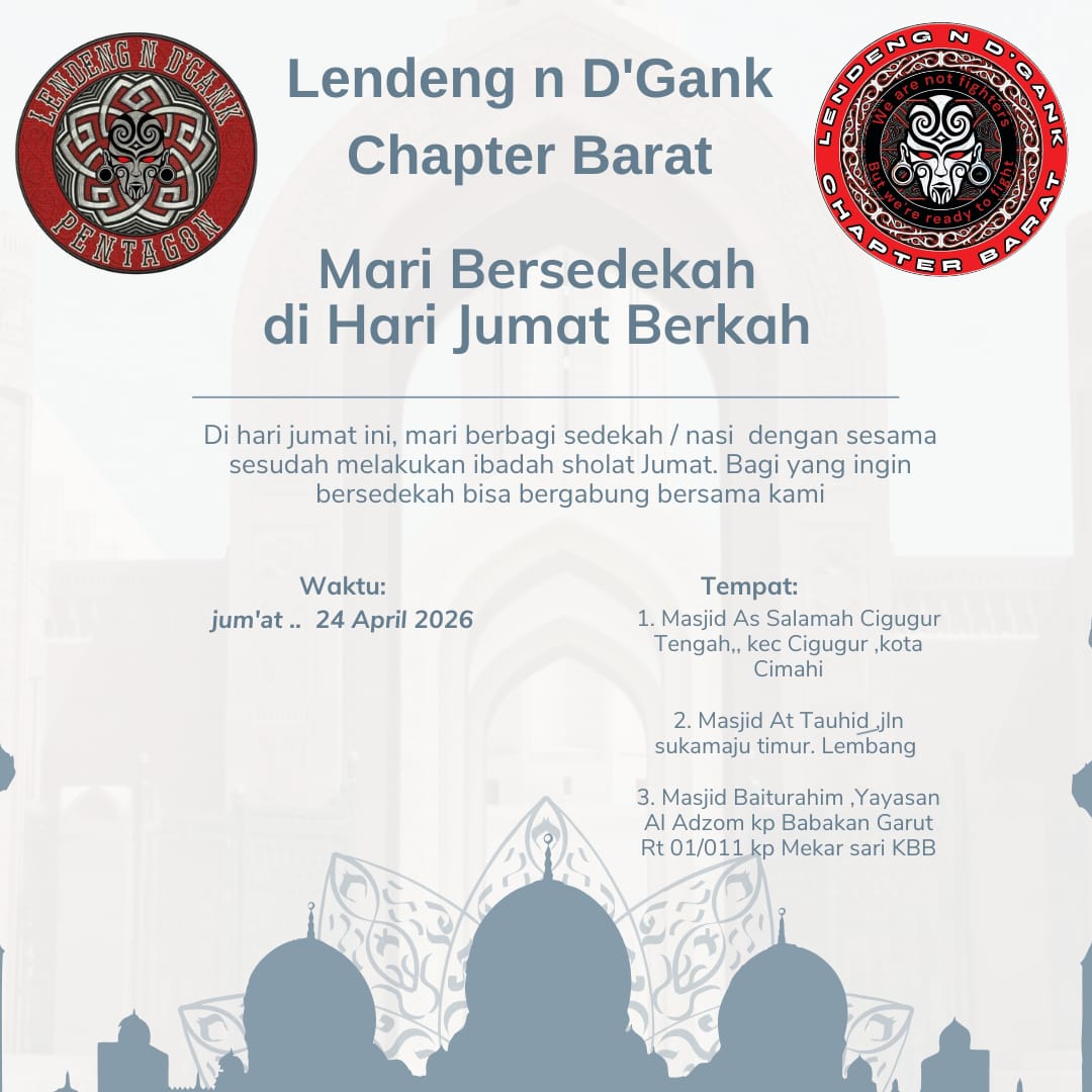Menyadari penderitaan sesama adalah langkah awal menuju kebaikan. Melalui gerakan “Mari Bersedekah di Hari Jumat Berkah,” kami, keluarga besar Lendeng n D’Gank Chapter Barat, tergerak untuk mengulurkan tangan. Tidak untuk dipuji, tetapi semata-mata untuk berbagi secercah harapan bagi mereka yang membutuhkan. Setiap butir nasi yang tersaji, setiap suapan yang terhidang, membawa doa dan harapan agar senyum kembali merekah di wajah saudara-saudara kita.