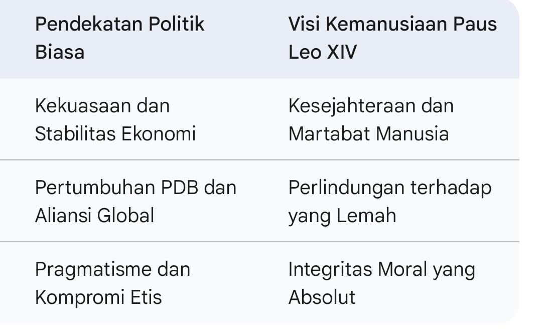 Paus Leo XIV mengeluarkan pernyataan tegas di tengah memburuknya krisis kemanusiaan di seluruh dunia, yang kerap terdesak oleh pertimbangan dan persaingan geopolitik. Beliau menegaskan bahwa segala bentuk kegiatan politik yang tidak berlandaskan pada nilai kemanusiaan adalah hal yang tidak bermoral dan tidak memiliki makna hakiki. 24 /04/2026
