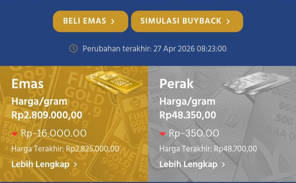 – Harga emas batangan kembali terkoreksi pada perdagangan Senin, 27 April 2026. Berdasarkan data resmi dari Logam Mulia Antam, harga emas hari ini berada di posisi Rp2.809.000 per gram, atau turun sebesar Rp16.000 dibandingkan hari sebelumnya yang sempat menyentuh angka Rp2.825.000 per gram. Penurunan ini turut diikuti oleh nilai jual kembali atau buyback, yang kini berada di angka Rp2.620.000 per gram, juga turun sebesar Rp16.000 dari harga sebelumnya.