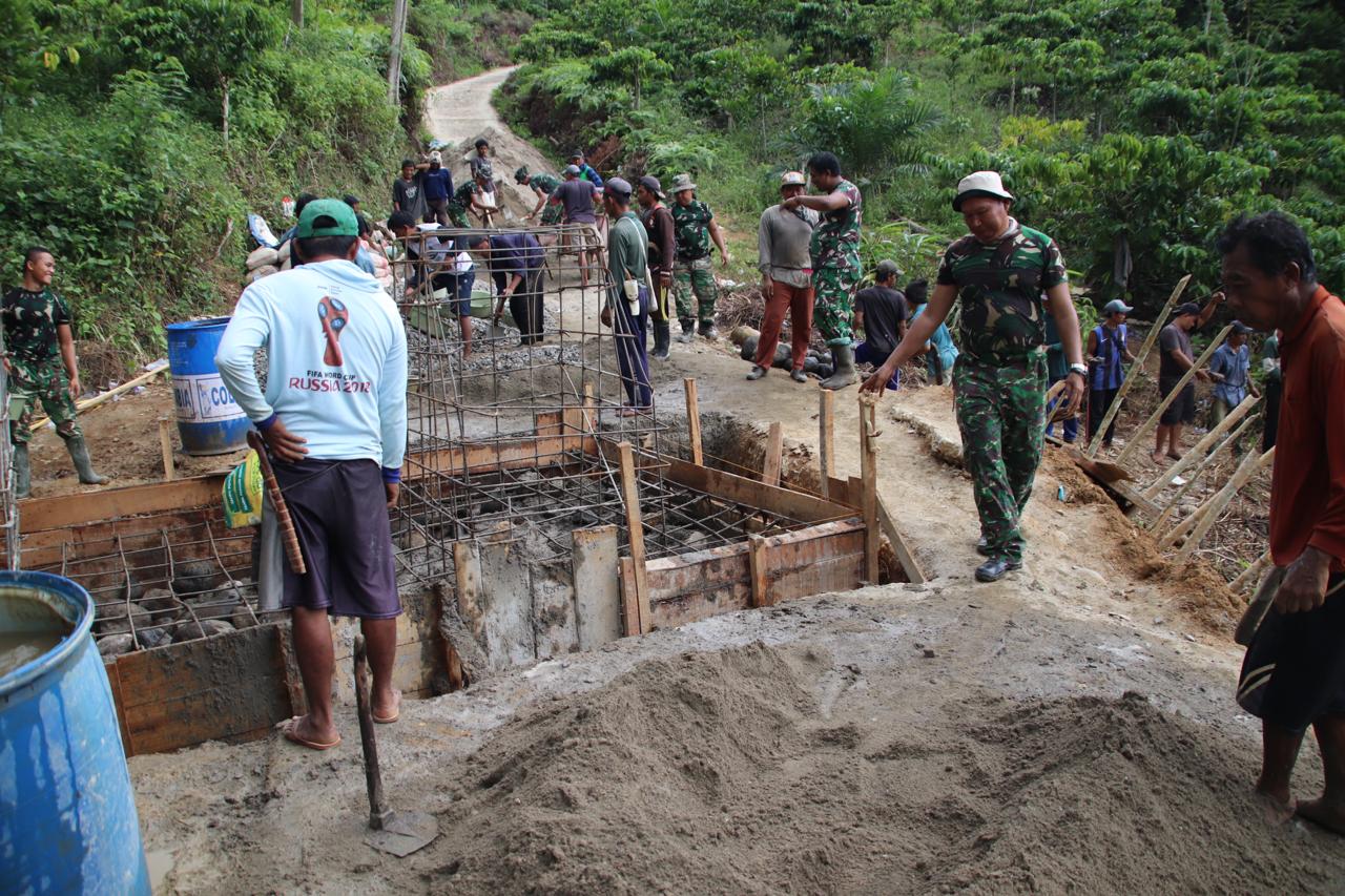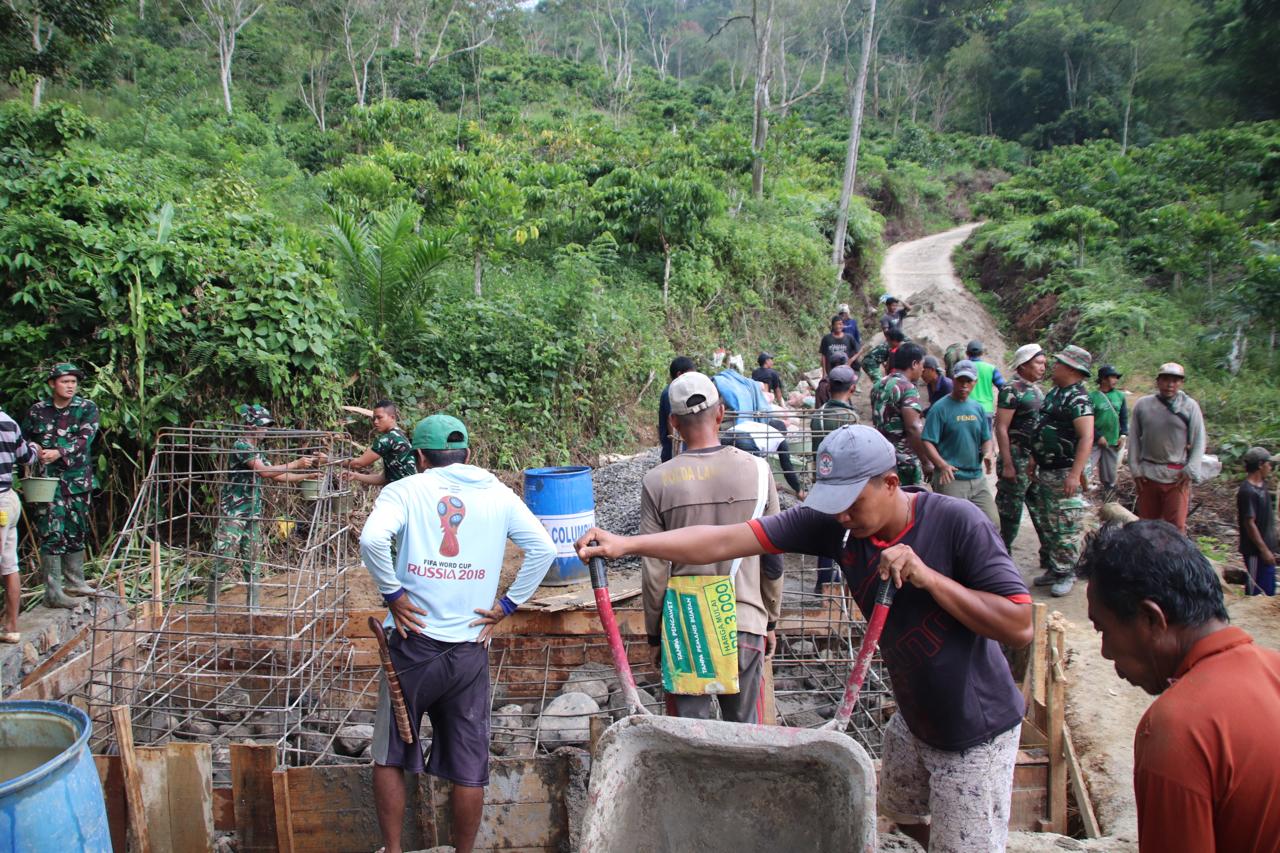 Sebanyak lima personel Koramil 412-10/TJR berkolaborasi dengan masyarakat bergotong royong tampak kental saat para prajurit bahu- membahu bersama puluhan warga dari dua desa itu.