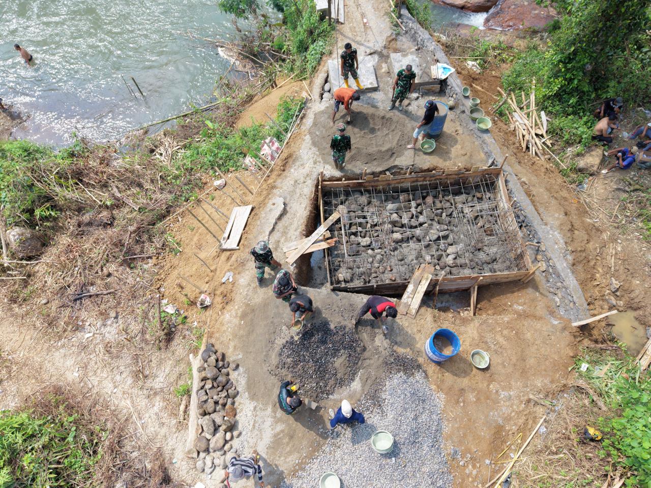 Tahap ini menjadi titik penentu kekuatan struktur jembatan gantung tersebut ke depan. ‘ujar Babinsa Sertu Johansyah saat dilokasi”.